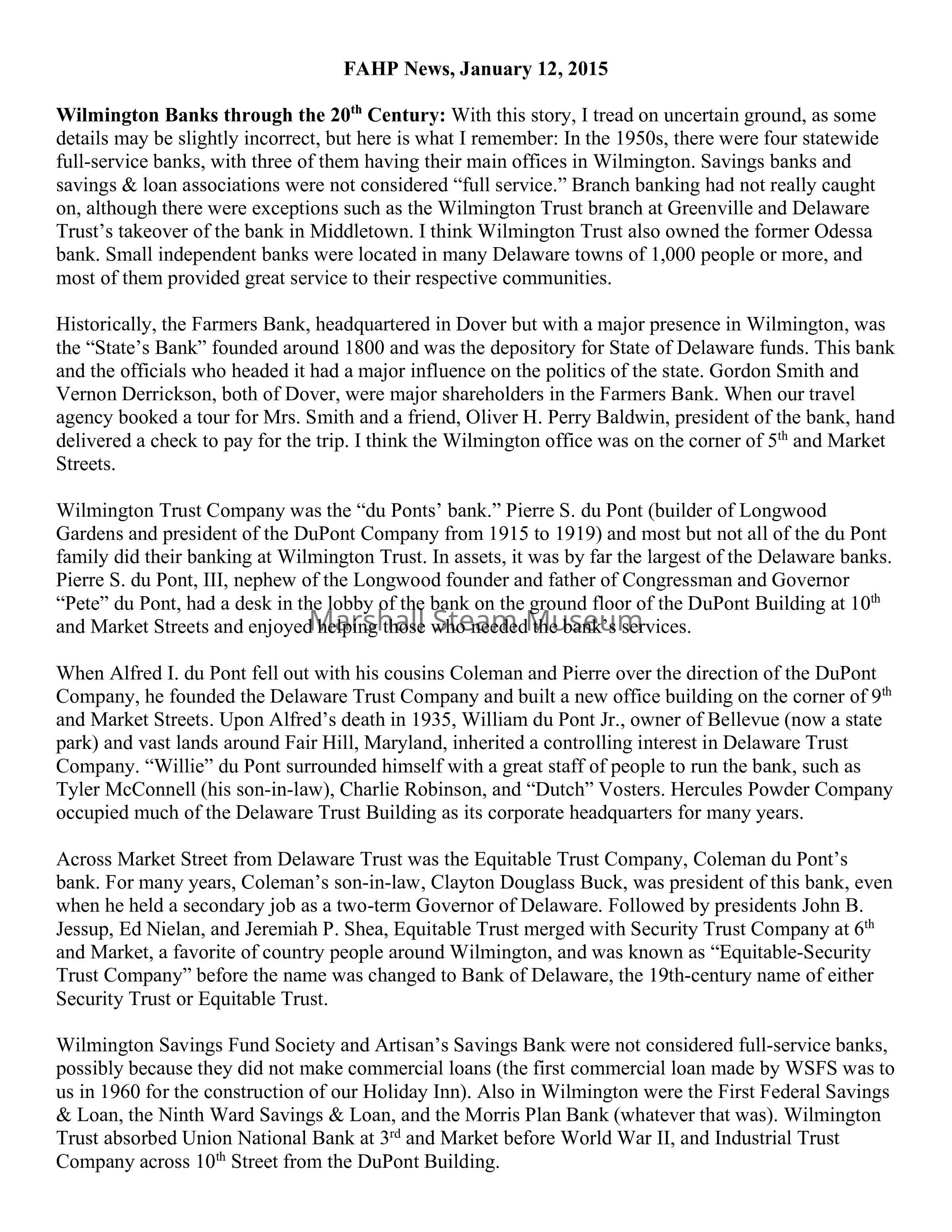 Wilmington Banks through the 20th Century: With this story, I tread on uncertain ground, as some details may be slightly incorrect, but here is what I remember: In the 1950s, there were four statewide full-service banks, with three of them having their main offices in Wilmington. Savings banks and savings & loan associations were not considered “full service.” Branch banking had not really caught on, although there were exceptions such as the Wilmington Trust branch at Greenville and Delaware Trust’s takeover of the bank in Middletown. I think Wilmington Trust also owned the former Odessa bank. Small independent banks were located in many Delaware towns of 1,000 people or more, and most of them provided great service to their respective communities.