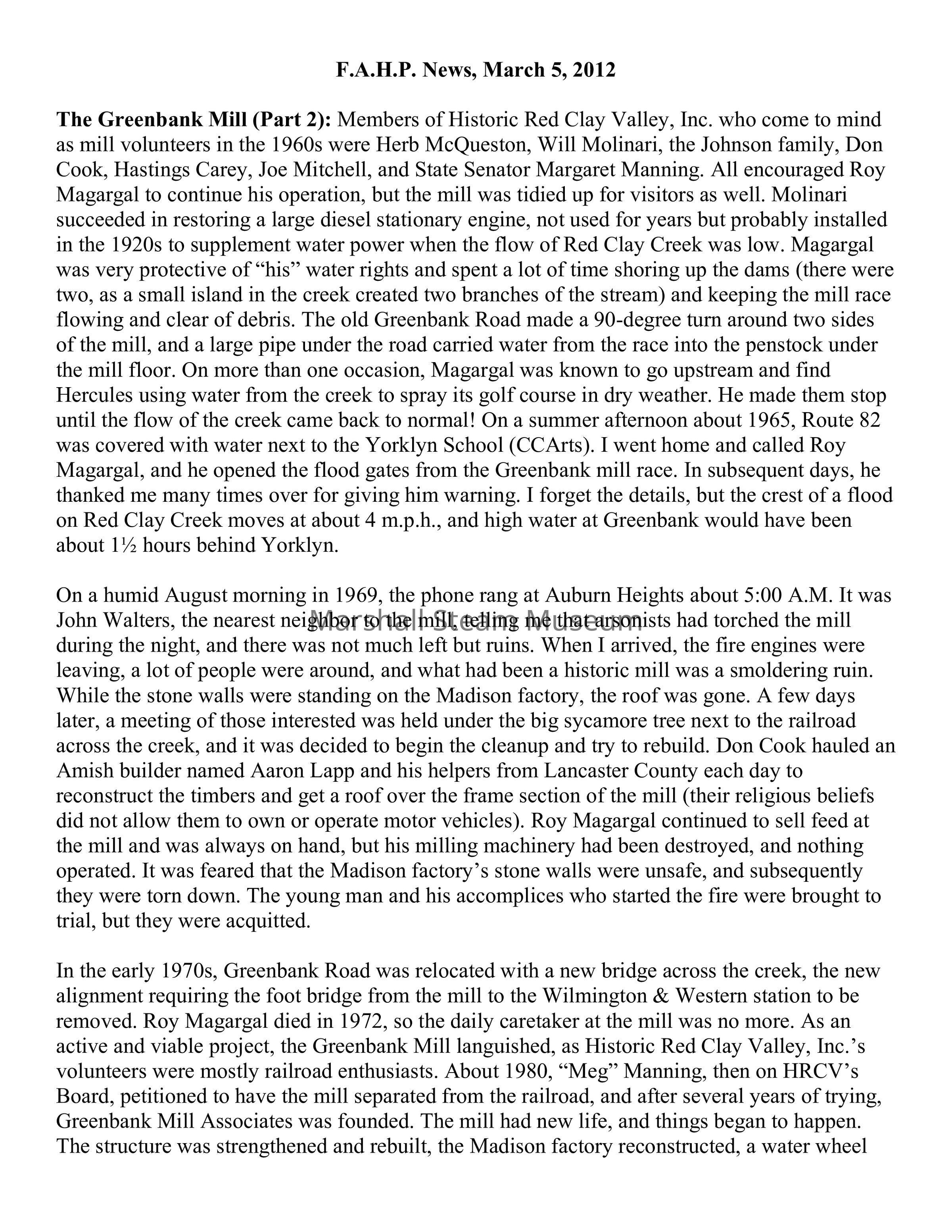 The Greenbank Mill (Part 2): Members of Historic Red Clay Valley, Inc. who come to mind as mill volunteers in the 1960s were Herb McQueston, Will Molinari, the Johnson family, Don Cook, Hastings Carey, Joe Mitchell, and State Senator Margaret Manning. All encouraged Roy Magargal to continue his operation, but the mill was tidied up for visitors as well. Molinari succeeded in restoring a large diesel stationary engine, not used for years but probably installed in the 1920s to supplement water power when the flow of Red Clay Creek was low. Magargal was very protective of “his” water rights and spent a lot of time shoring up the dams (there were two, as a small island in the creek created two branches of the stream) and keeping the mill race flowing and clear of debris. The old Greenbank Road made a 90-degree turn around two sides of the mill, and a large pipe under the road carried water from the race into the penstock under the mill floor. On more than one occasion, Magargal was known to go upstream and find Hercules using water from the creek to spray its golf course in dry weather. He made them stop until the flow of the creek came back to normal! On a summer afternoon about 1965, Route 82 was covered with water next to the Yorklyn School (CCArts). I went home and called Roy Magargal, and he opened the flood gates from the Greenbank mill race. In subsequent days, he thanked me many times over for giving him warning. I forget the details, but the crest of a flood on Red Clay Creek moves at about 4 m.p.h., and high water at Greenbank would have been about 1½ hours behind Yorklyn.