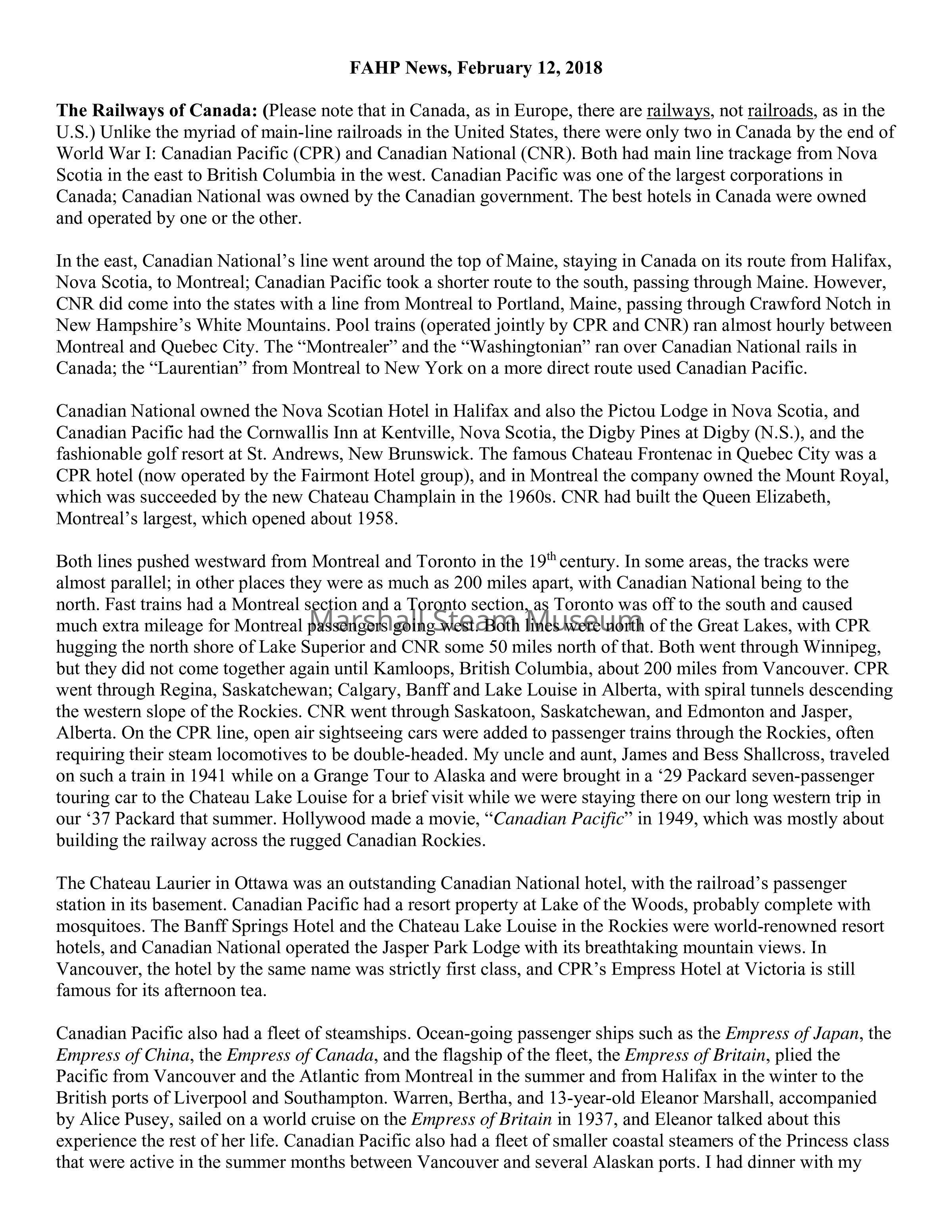 The Railways of Canada: (Please note that in Canada, as in Europe, there are railways, not railroads, as in the U.S.) Unlike the myriad of main-line railroads in the United States, there were only two in Canada by the end of World War I: Canadian Pacific (CPR) and Canadian National (CNR). Both had main line trackage from Nova Scotia in the east to British Columbia in the west. Canadian Pacific was one of the largest corporations in Canada; Canadian National was owned by the Canadian government. The best hotels in Canada were owned and operated by one or the other.