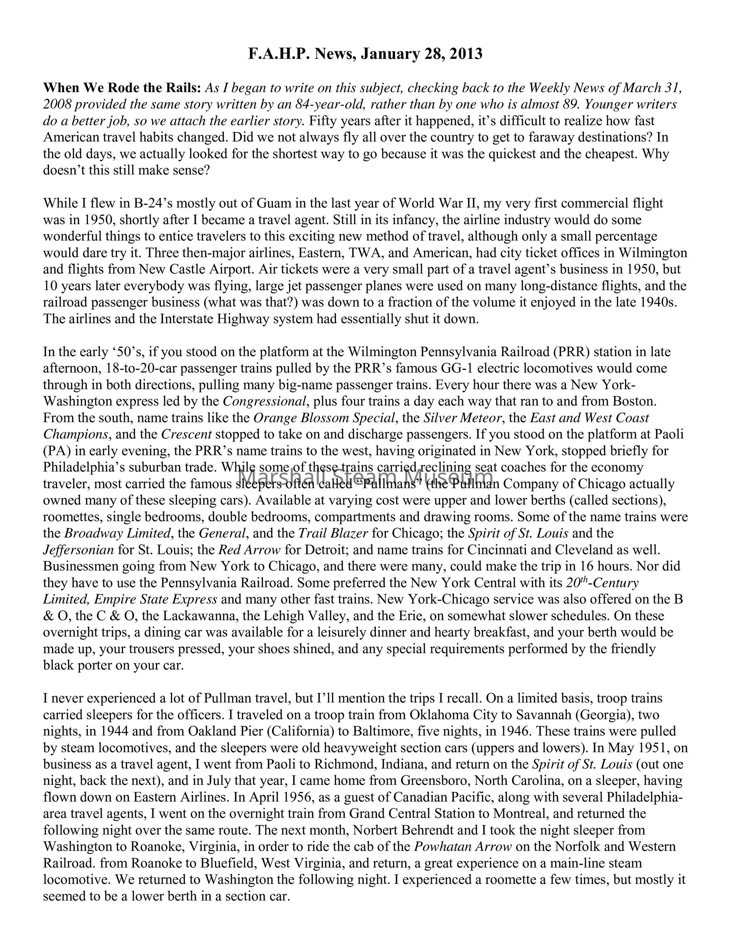When We Rode the Rails: As I began to write on this subject, checking back to the Weekly News of March 31, 2008 provided the same story written by an 84-year-old, rather than by one who is almost 89. Younger writers do a better job, so we attach the earlier story. Fifty years after it happened, it’s difficult to realize how fast American travel habits changed. Did we not always fly all over the country to get to faraway destinations? In the old days, we actually looked for the shortest way to go because it was the quickest and the cheapest. Why doesn’t this still make sense?