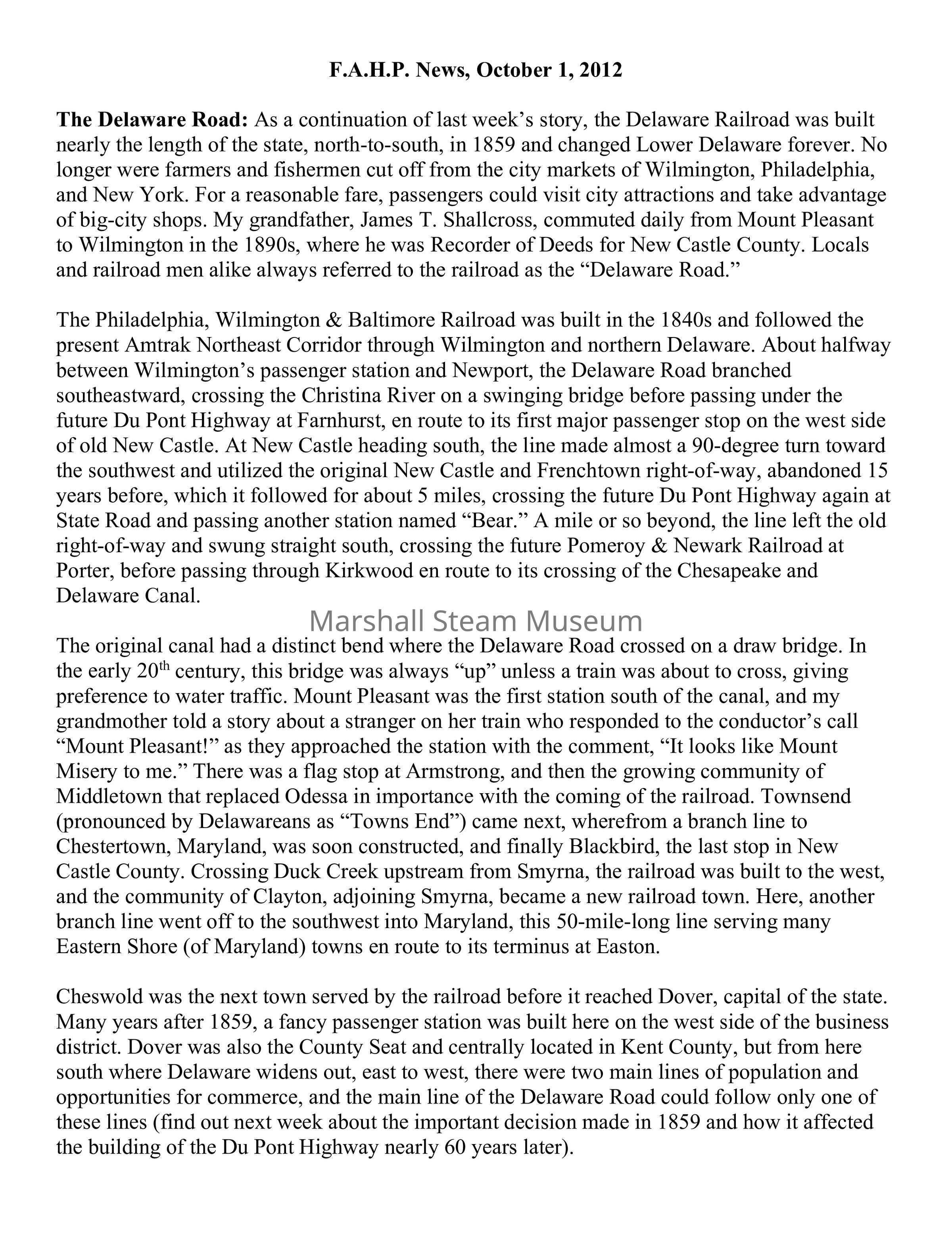 The Delaware Road: As a continuation of last week’s story, the Delaware Railroad was built nearly the length of the state, north-to-south, in 1859 and changed Lower Delaware forever. No longer were farmers and fishermen cut off from the city markets of Wilmington, Philadelphia, and New York. For a reasonable fare, passengers could visit city attractions and take advantage of big-city shops. My grandfather, James T. Shallcross, commuted daily from Mount Pleasant to Wilmington in the 1890s, where he was Recorder of Deeds for New Castle County. Locals and railroad men alike always referred to the railroad as the “Delaware Road.”