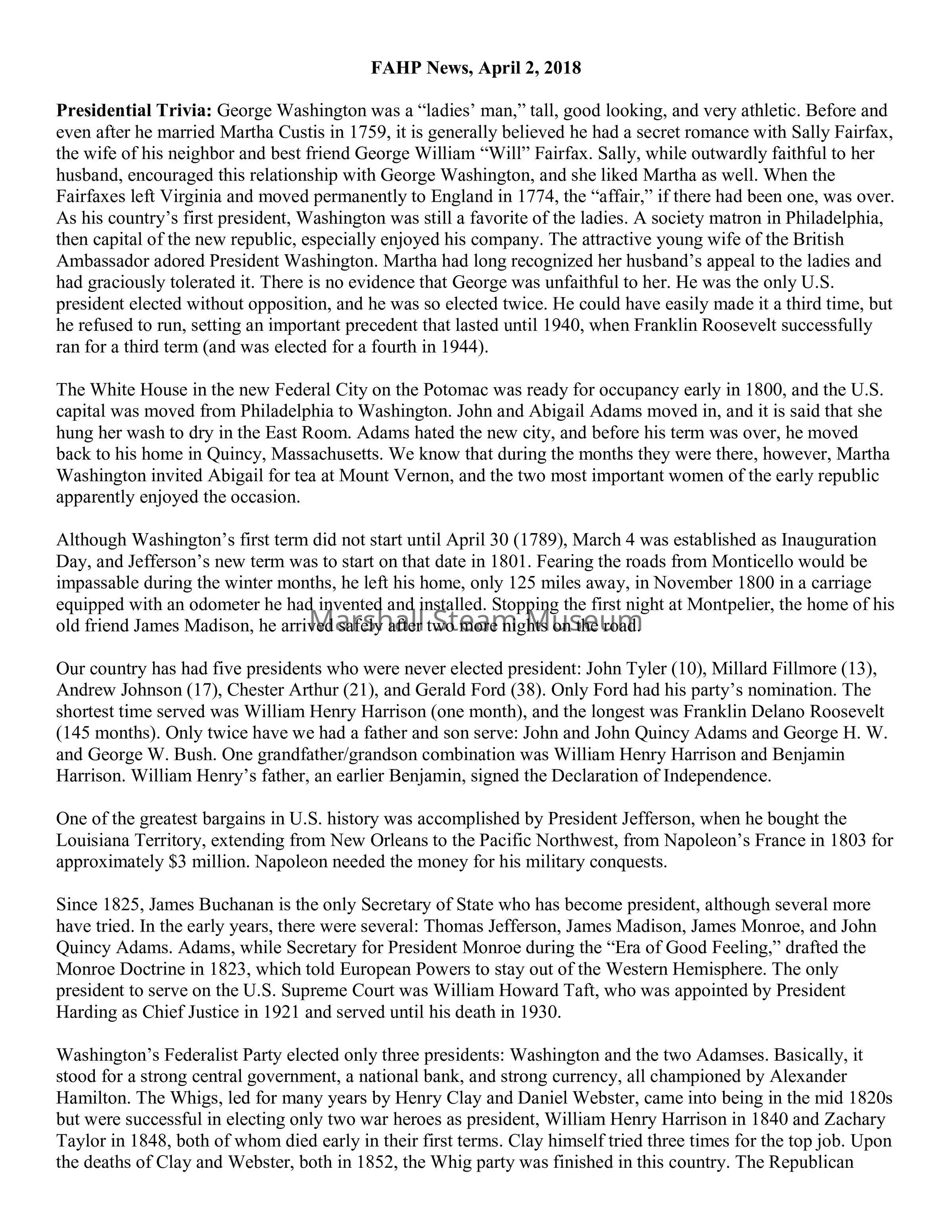 Presidential Trivia: George Washington was a “ladies’ man,” tall, good looking, and very athletic. Before and even after he married Martha Custis in 1759, it is generally believed he had a secret romance with Sally Fairfax, the wife of his neighbor and best friend George William “Will” Fairfax. Sally, while outwardly faithful to her husband, encouraged this relationship with George Washington, and she liked Martha as well. When the Fairfaxes left Virginia and moved permanently to England in 1774, the “affair,” if there had been one, was over. As his country’s first president, Washington was still a favorite of the ladies. A society matron in Philadelphia, then capital of the new republic, especially enjoyed his company. The attractive young wife of the British Ambassador adored President Washington. Martha had long recognized her husband’s appeal to the ladies and had graciously tolerated it. There is no evidence that George was unfaithful to her. He was the only U.S. president elected without opposition, and he was so elected twice. He could have easily made it a third time, but he refused to run, setting an important precedent that lasted until 1940, when Franklin Roosevelt successfully ran for a third term (and was elected for a fourth in 1944).