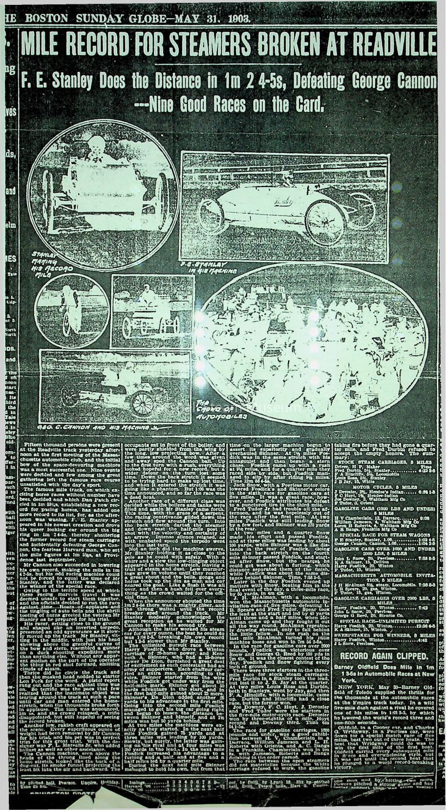 1903 article in Boston Globe regarding FE Stanley speed record at Readville, MA