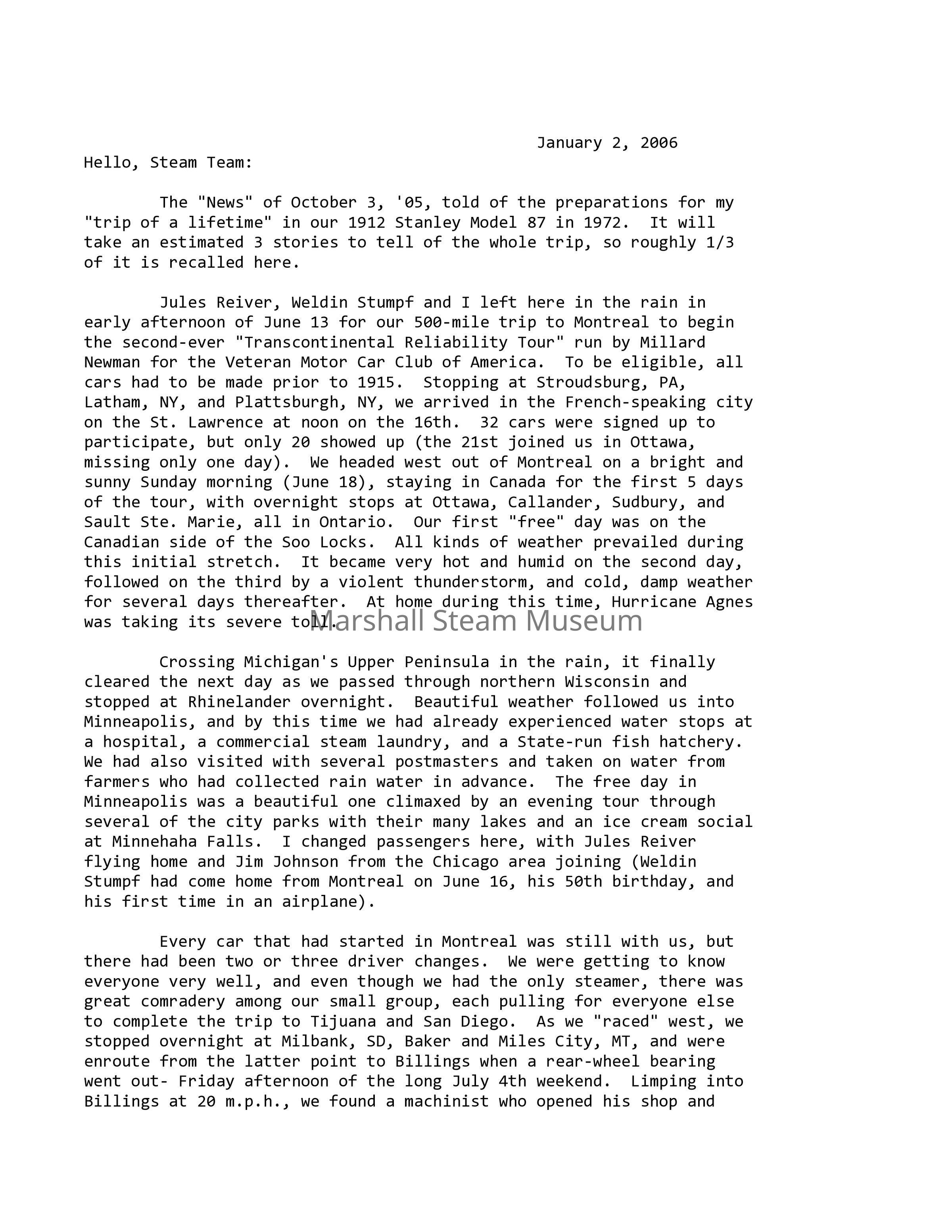The "News" of October 3, '05, told of the preparations for my "trip of a lifetime" in our 1912 Stanley Model 87 in 1972. It will take an estimated 3 stories to tell of the whole trip, so roughly 1/3 of it is recalled here.