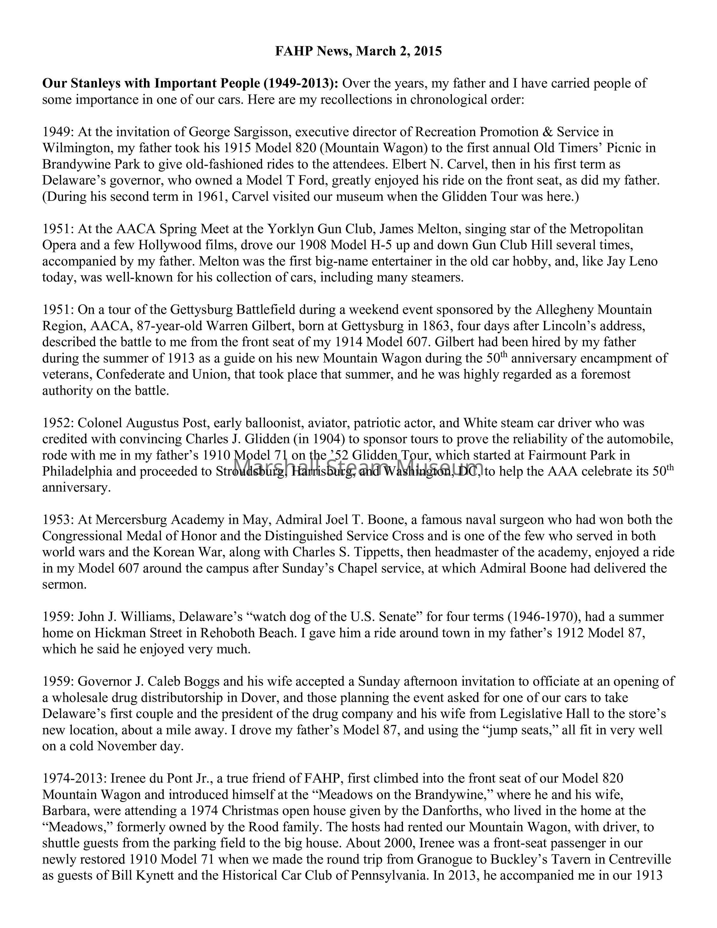 Our Stanleys with Important People (1949-2013): Over the years, my father and I have carried people of some importance in one of our cars. Here are my recollections in chronological order: