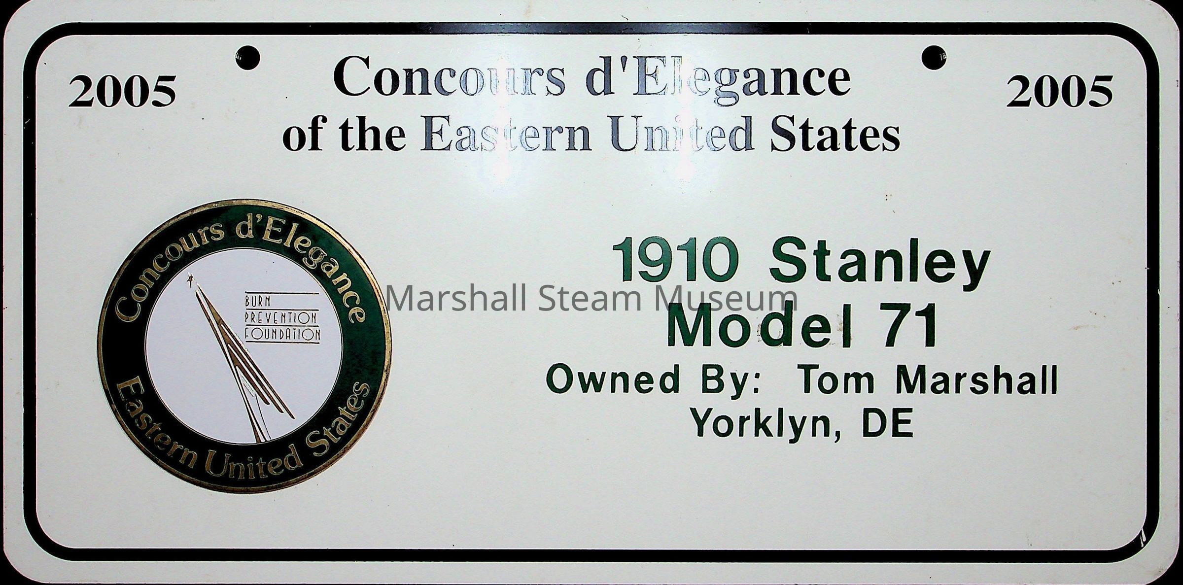 License plate used at the 2005 Eastern United States Concours d'Elegance with the 1910 Stanley Model 71Collection