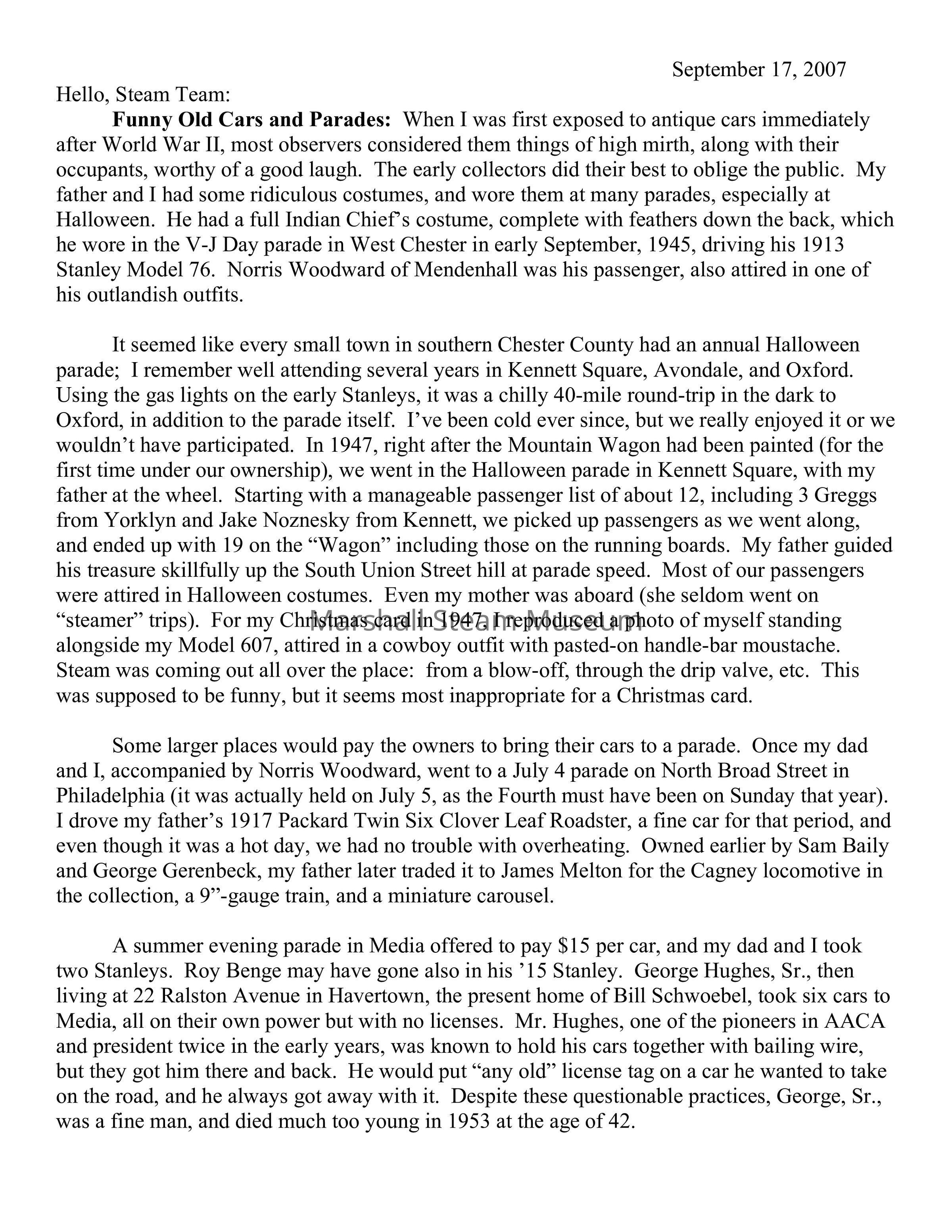 It seemed like every small town in southern Chester County had an annual Halloween parade; I remember well attending several years in Kennett Square, Avondale, and Oxford. Using the gas lights on the early Stanleys, it was a chilly 40-mile round-trip in the dark to Oxford, in addition to the parade itself. I’ve been cold ever since, but we really enjoyed it or we wouldn’t have participated. In 1947, right after the Mountain Wagon had been painted (for the first time under our ownership), we went in the Halloween parade in Kennett Square, with my father at the wheel. Starting with a manageable passenger list of about 12, including 3 Greggs from Yorklyn and Jake Noznesky from Kennett, we picked up passengers as we went along, and ended up with 19 on the “Wagon” including those on the running boards. My father guided his treasure skillfully up the South Union Street hill at parade speed. Most of our passengers were attired in Halloween costumes. Even my mother was aboard (she seldom went on “steamer” trips). For my Christmas card in 1947, I reproduced a photo of myself standing alongside my Model 607, attired in a cowboy outfit with pasted-on handle-bar moustache. Steam was coming out all over the place: from a blow-off, through the drip valve, etc. This was supposed to be funny, but it seems most inappropriate for a Christmas card.