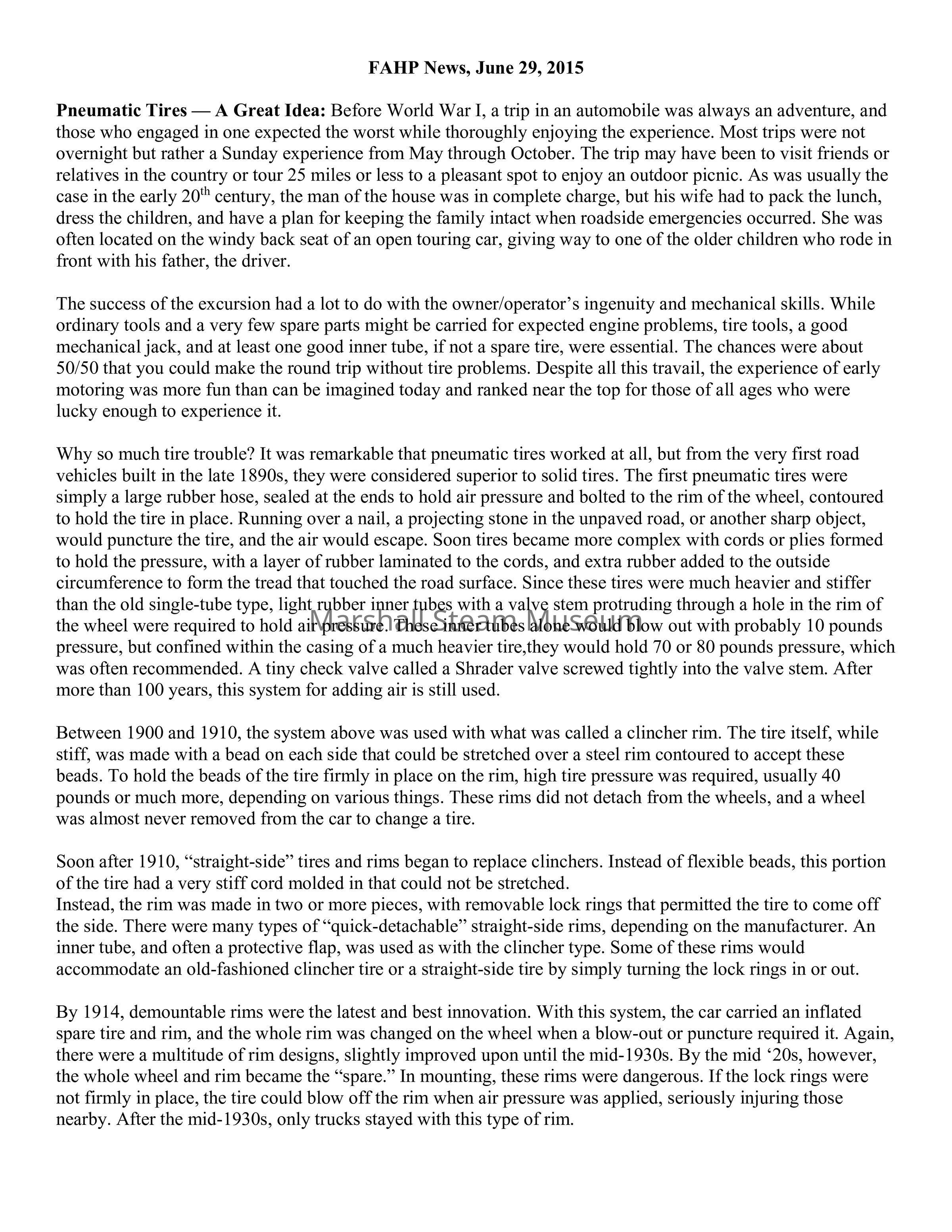 Pneumatic Tires — A Great Idea: Before World War I, a trip in an automobile was always an adventure, and those who engaged in one expected the worst while thoroughly enjoying the experience. Most trips were not overnight but rather a Sunday experience from May through October. The trip may have been to visit friends or relatives in the country or tour 25 miles or less to a pleasant spot to enjoy an outdoor picnic. As was usually the case in the early 20th century, the man of the house was in complete charge, but his wife had to pack the lunch, dress the children, and have a plan for keeping the family intact when roadside emergencies occurred. She was often located on the windy back seat of an open touring car, giving way to one of the older children who rode in front with his father, the driver.