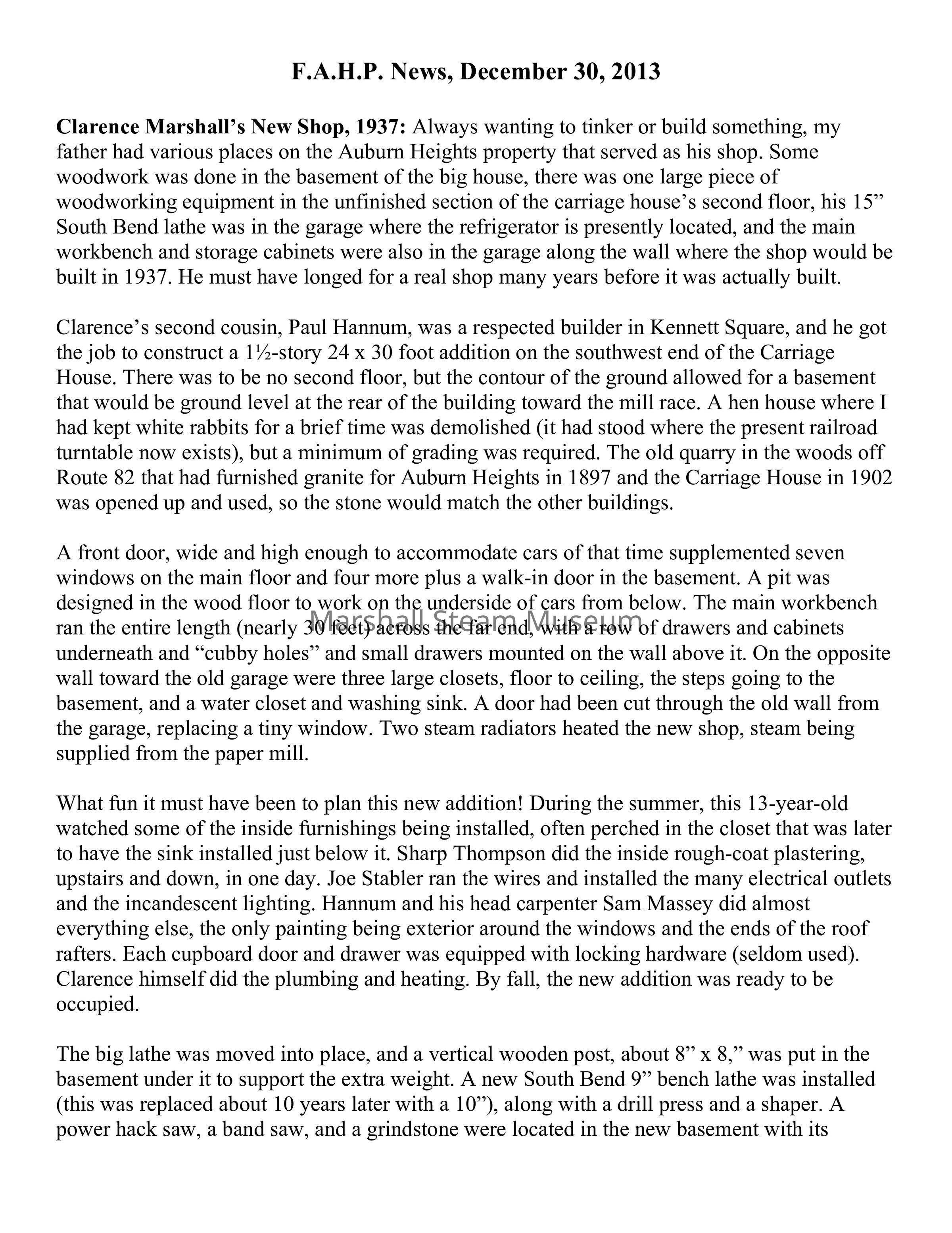 Clarence Marshall’s New Shop, 1937: Always wanting to tinker or build something, my father had various places on the Auburn Heights property that served as his shop. Some woodwork was done in the basement of the big house, there was one large piece of woodworking equipment in the unfinished section of the carriage house’s second floor, his 15” South Bend lathe was in the garage where the refrigerator is presently located, and the main workbench and storage cabinets were also in the garage along the wall where the shop would be built in 1937. He must have longed for a real shop many years before it was actually built.