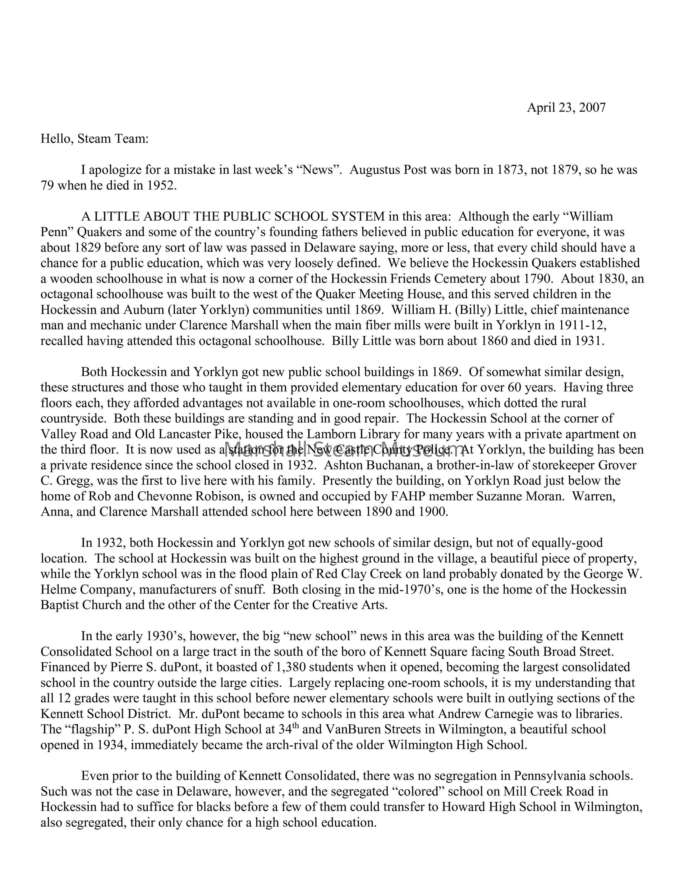 A LITTLE ABOUT THE PUBLIC SCHOOL SYSTEM in this area: Although the early “William Penn” Quakers and some of the country’s founding fathers believed in public education for everyone, it was about 1829 before any sort of law was passed in Delaware saying, more or less, that every child should have a chance for a public education, which was very loosely defined. We believe the Hockessin Quakers established a wooden schoolhouse in what is now a corner of the Hockessin Friends Cemetery about 1790. About 1830, an octagonal schoolhouse was built to the west of the Quaker Meeting House, and this served children in the Hockessin and Auburn (later Yorklyn) communities until 1869. William H. (Billy) Little, chief maintenance man and mechanic under Clarence Marshall when the main fiber mills were built in Yorklyn in 1911-12, recalled having attended this octagonal schoolhouse. Billy Little was born about 1860 and died in 1931.
