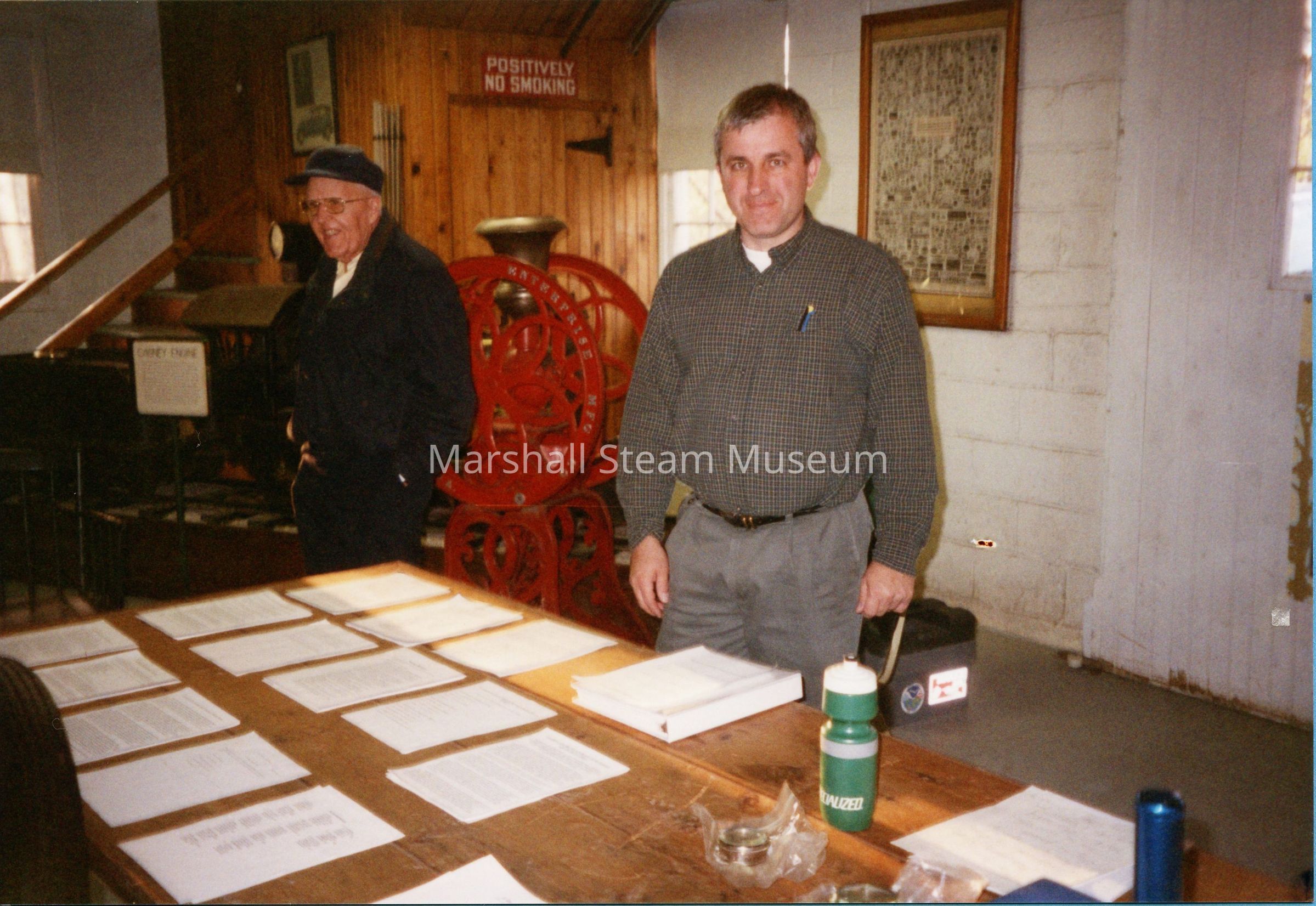 John Hopkins teaching a Steam Team class on tools and supplies to be carried when driving a Stanley steam car. Tom Marshall is observing on the left.Photograph Details