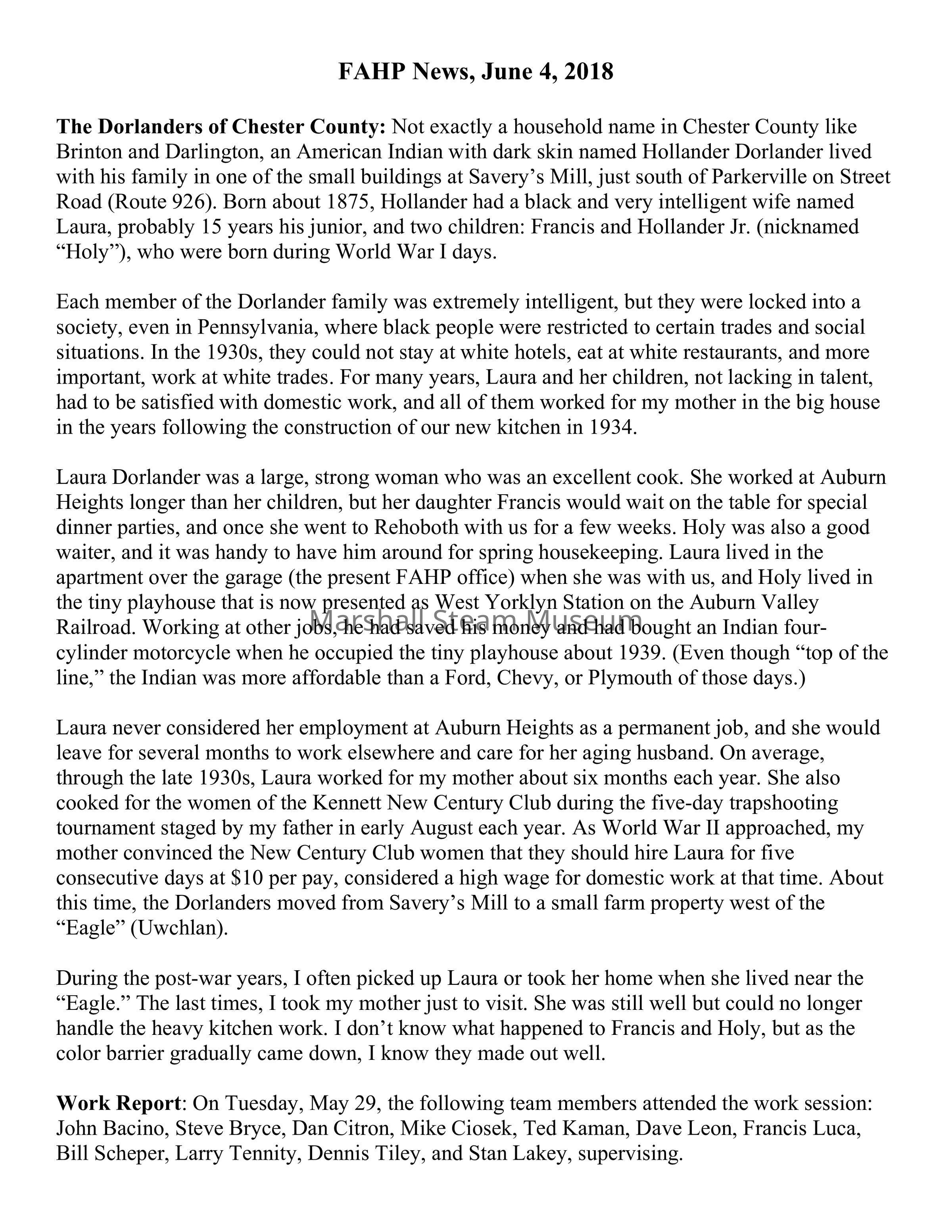 Laura Dorlander was a large, strong woman who was an excellent cook. She worked at Auburn Heights longer than her children, but her daughter Francis would wait on the table for special dinner parties, and once she went to Rehoboth with us for a few weeks. Holy was also a good waiter, and it was handy to have him around for spring housekeeping. Laura lived in the apartment over the garage (the present FAHP office) when she was with us, and Holy lived in the tiny playhouse that is now presented as West Yorklyn Station on the Auburn Valley Railroad. Working at other jobs, he had saved his money and had bought an Indian four-cylinder motorcycle when he occupied the tiny playhouse about 1939. (Even though “top of the line,” the Indian was more affordable than a Ford, Chevy, or Plymouth of those days.)
