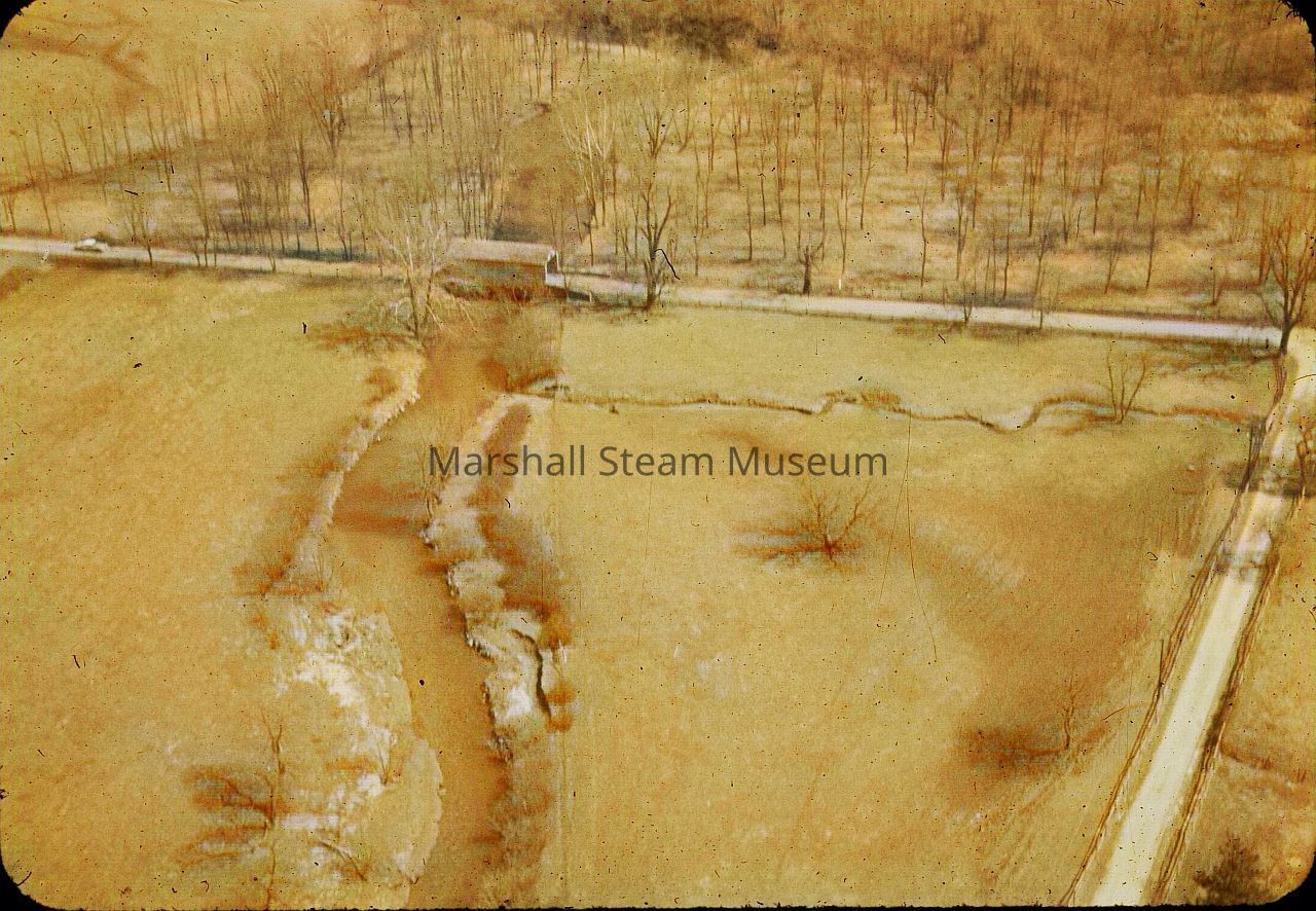 The bridge is clearly visible with the former Ashland Flour Mill millrace entering far upper left and dumping back into the creek top center. The driveway lower right now serves the nature center.Photograph Details
