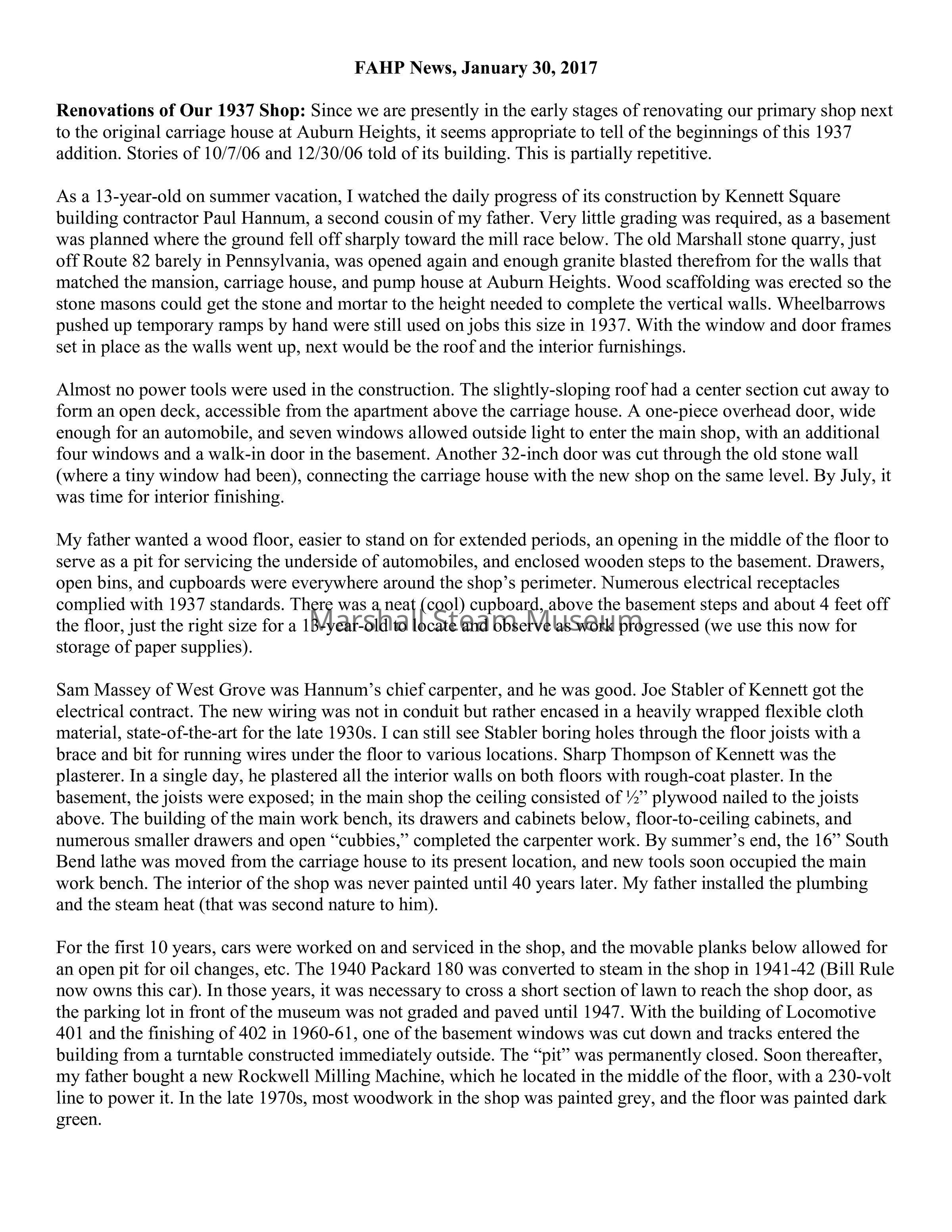 Late in 2016, work was undertaken by FAHP volunteers led by Mark Bodenstab to revamp and revitalize the heavily used shop. In some cases, heavily used supplies and tools will be relocated, the water-damaged ceiling will be replaced, ceiling insulation will be added, and the whole place will be repainted. New railings have been installed on the basement steps. The “Engine House” in the basement is being improved. The milling machine will be removed to another location, and a second work bench will occupy the center of the shop. We hope many FAHP volunteers will help Mark as this project moves along in the coming weeks.