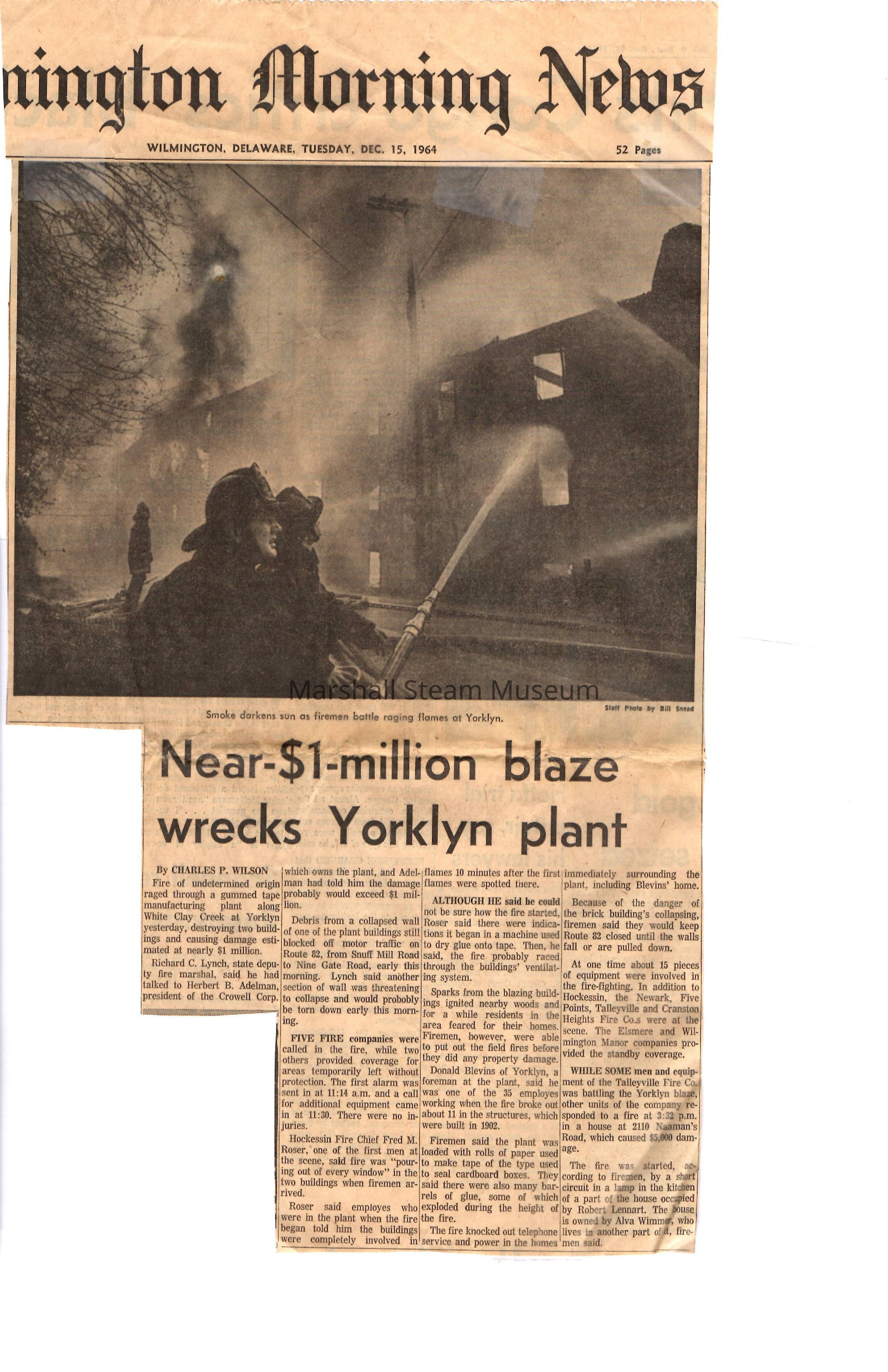 Front page clipping of the December 15, 1964, Wilmington (DE) Morning News regarding the Crowell Tape Mill fireCollection