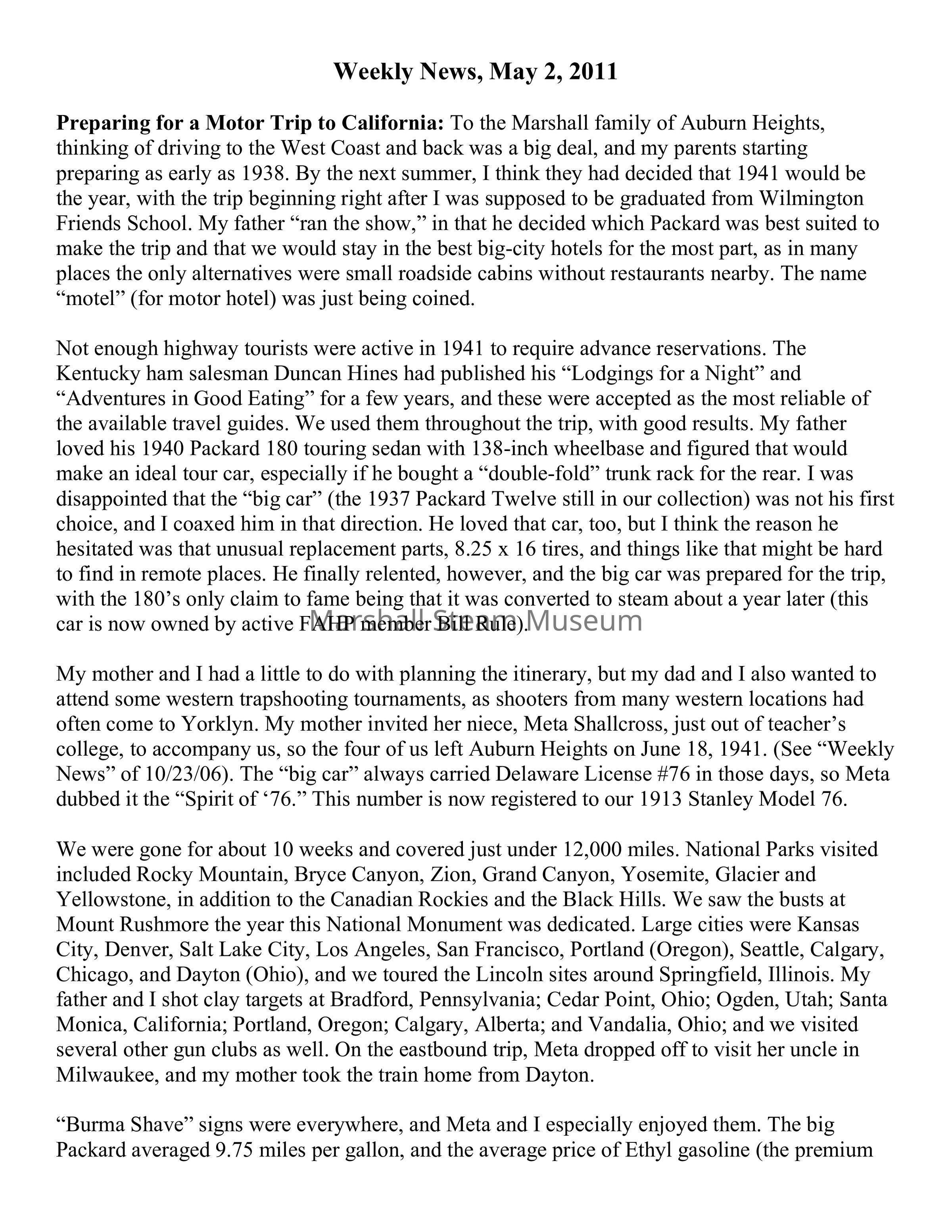 Preparing for a Motor Trip to California: To the Marshall family of Auburn Heights, thinking of driving to the West Coast and back was a big deal, and my parents starting preparing as early as 1938. By the next summer, I think they had decided that 1941 would be the year, with the trip beginning right after I was supposed to be graduated from Wilmington Friends School. My father “ran the show,” in that he decided which Packard was best suited to make the trip and that we would stay in the best big-city hotels for the most part, as in many places the only alternatives were small roadside cabins without restaurants nearby. The name “motel” (for motor hotel) was just being coined.