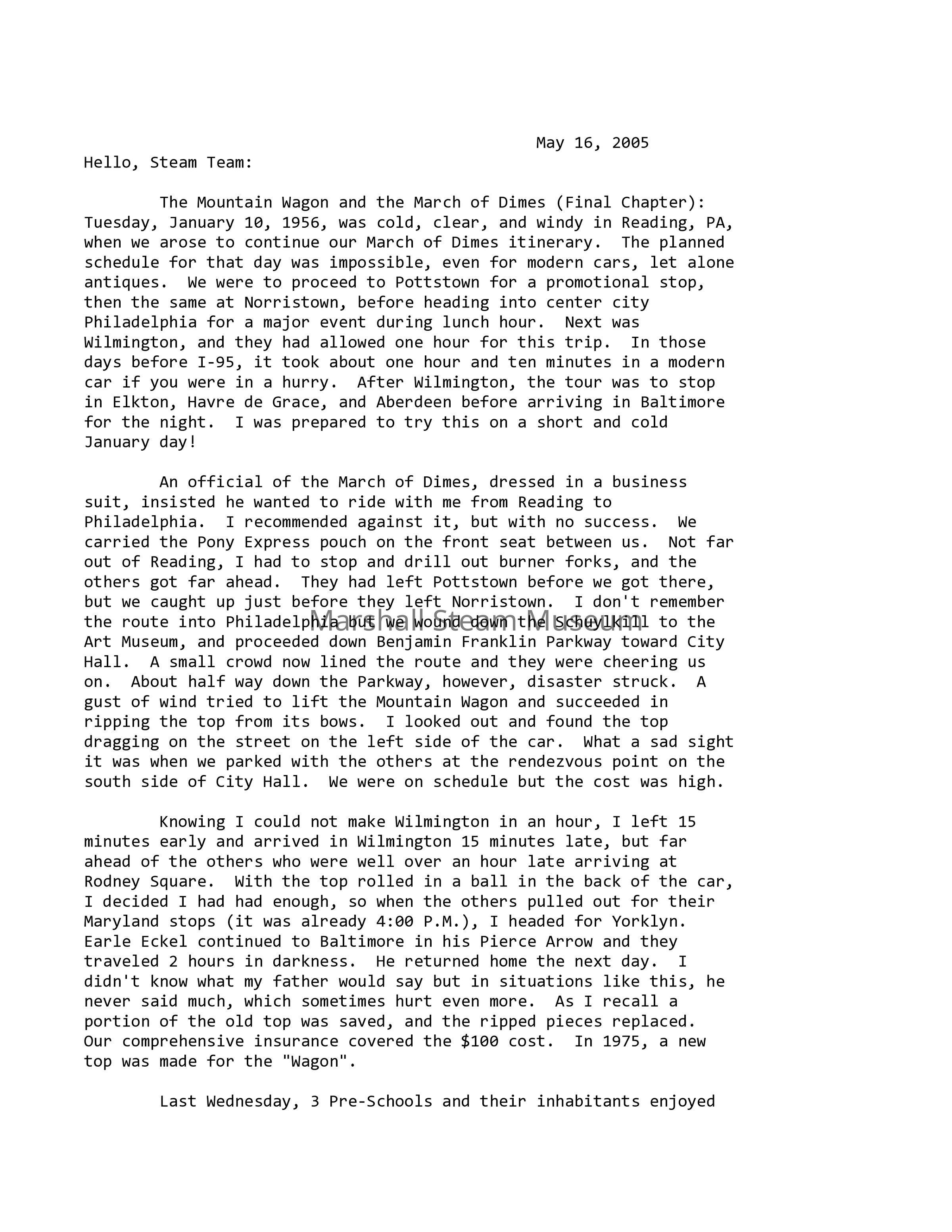 The Mountain Wagon and the March of Dimes (Final Chapter): Tuesday, January 10, 1956, was cold, clear, and windy in Reading, PA, when we arose to continue our March of Dimes itinerary. The planned schedule for that day was impossible, even for modern cars, let alone antiques. We were to proceed to Pottstown for a promotional stop, then the same at Norristown, before heading into center city Philadelphia for a major event during lunch hour. Next was Wilmington, and they had allowed one hour for this trip. In those days before I-95, it took about one hour and ten minutes in a modern car if you were in a hurry. After Wilmington, the tour was to stop in Elkton, Havre de Grace, and Aberdeen before arriving in Baltimore for the night. I was prepared to try this on a short and cold January day!