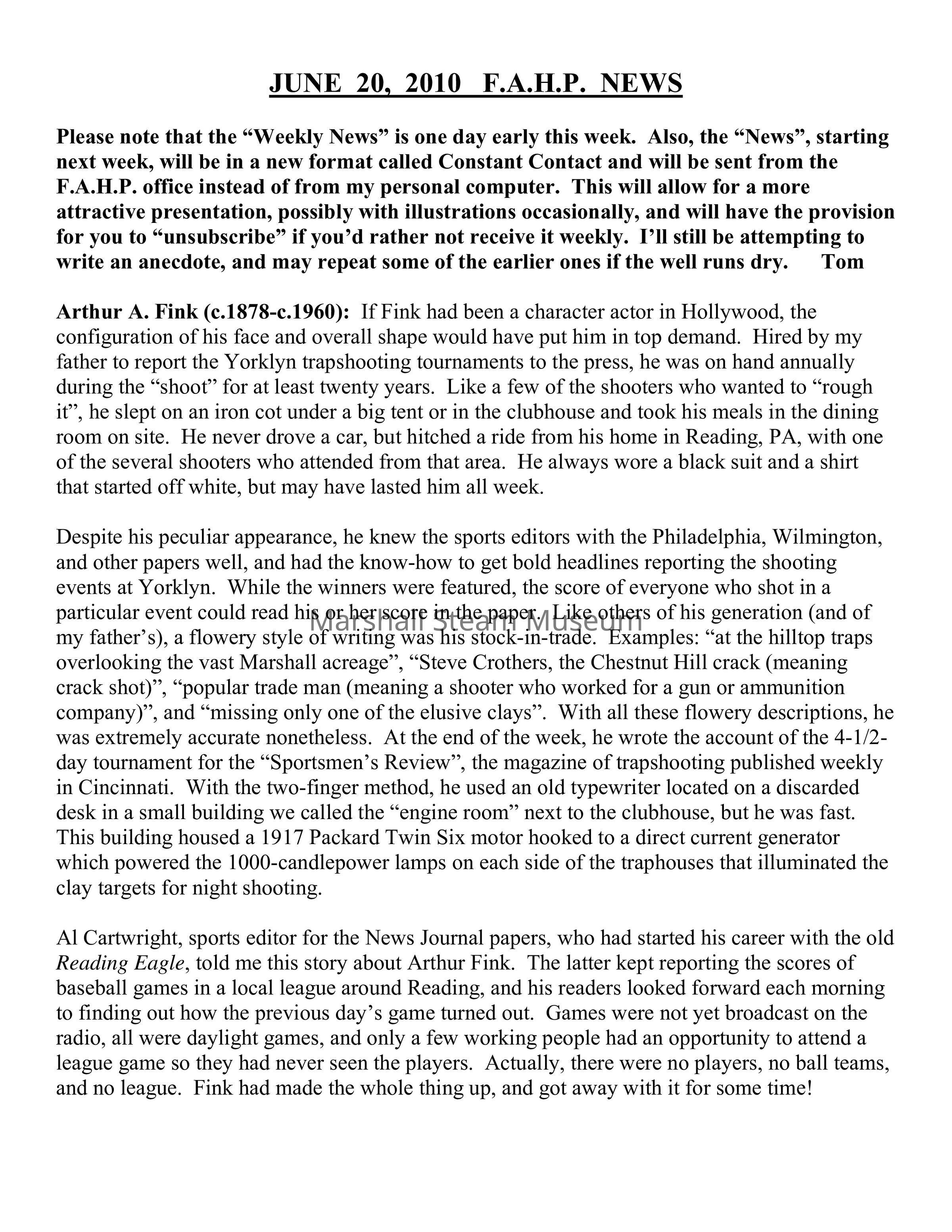Please note that the “Weekly News” is one day early this week. Also, the “News”, starting next week, will be in a new format called Constant Contact and will be sent from the F.A.H.P. office instead of from my personal computer. This will allow for a more attractive presentation, possibly with illustrations occasionally, and will have the provision for you to “unsubscribe” if you’d rather not receive it weekly. I’ll still be attempting to write an anecdote, and may repeat some of the earlier ones if the well runs dry. Tom