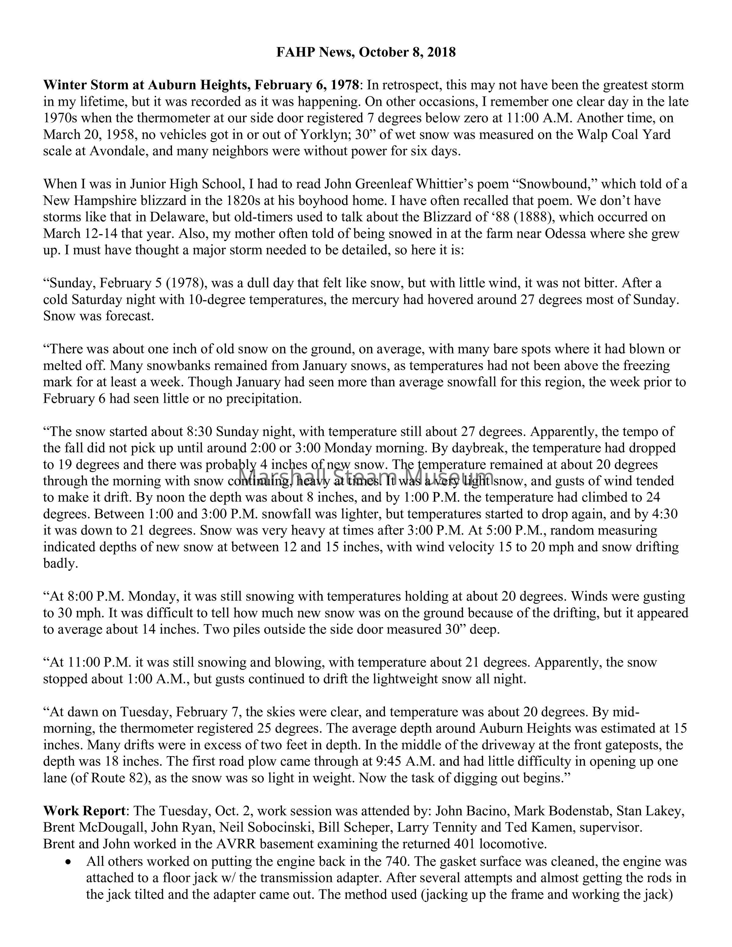 Winter Storm at Auburn Heights, February 6, 1978: In retrospect, this may not have been the greatest storm in my lifetime, but it was recorded as it was happening. On other occasions, I remember one clear day in the late 1970s when the thermometer at our side door registered 7 degrees below zero at 11:00 A.M. Another time, on March 20, 1958, no vehicles got in or out of Yorklyn; 30” of wet snow was measured on the Walp Coal Yard scale at Avondale, and many neighbors were without power for six days.