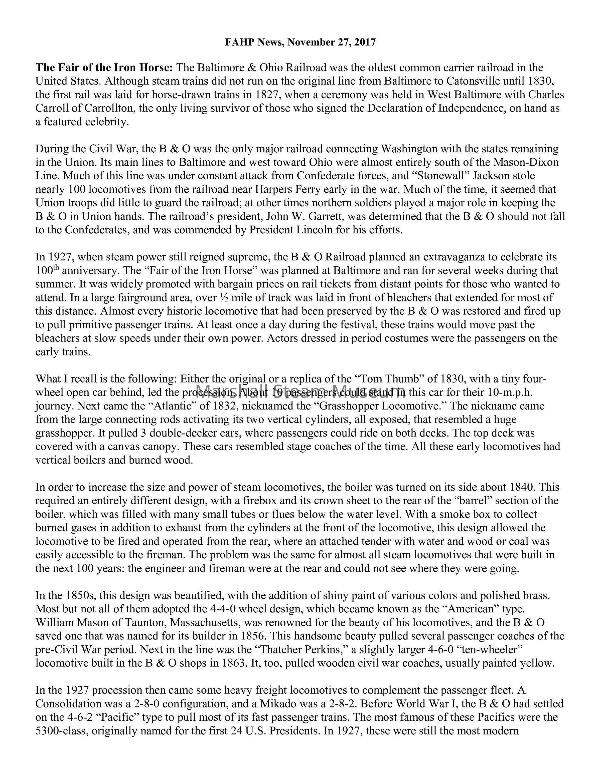 The Fair of the Iron Horse: The Baltimore & Ohio Railroad was the oldest common carrier railroad in the United States. Although steam trains did not run on the original line from Baltimore to Catonsville until 1830, the first rail was laid for horse-drawn trains in 1827, when a ceremony was held in West Baltimore with Charles Carroll of Carrollton, the only living survivor of those who signed the Declaration of Independence, on hand as a featured celebrity.