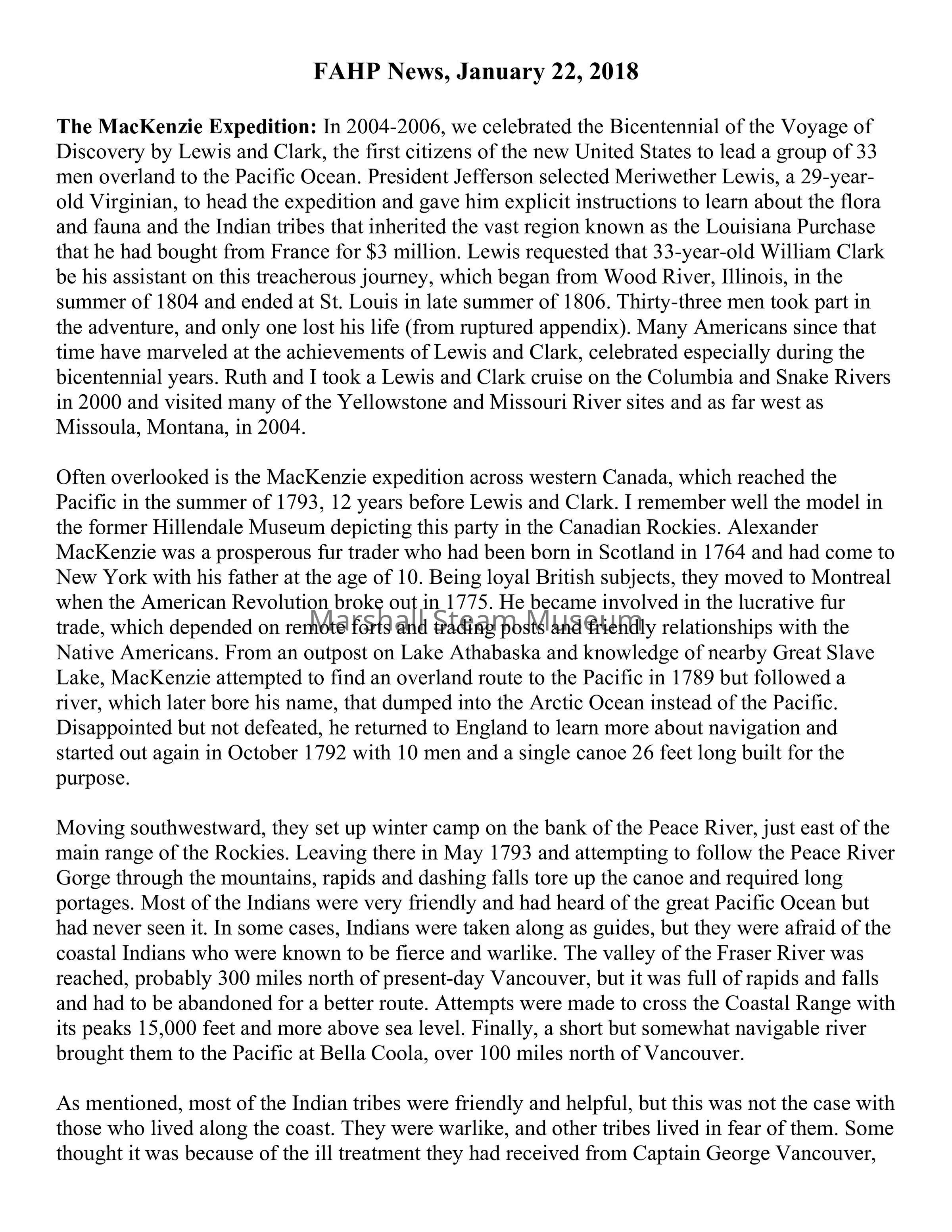 Often overlooked is the MacKenzie expedition across western Canada, which reached the Pacific in the summer of 1793, 12 years before Lewis and Clark. I remember well the model in the former Hillendale Museum depicting this party in the Canadian Rockies. Alexander MacKenzie was a prosperous fur trader who had been born in Scotland in 1764 and had come to New York with his father at the age of 10. Being loyal British subjects, they moved to Montreal when the American Revolution broke out in 1775. He became involved in the lucrative fur trade, which depended on remote forts and trading posts and friendly relationships with the Native Americans. From an outpost on Lake Athabaska and knowledge of nearby Great Slave Lake, MacKenzie attempted to find an overland route to the Pacific in 1789 but followed a river, which later bore his name, that dumped into the Arctic Ocean instead of the Pacific. Disappointed but not defeated, he returned to England to learn more about navigation and started out again in October 1792 with 10 men and a single canoe 26 feet long built for the purpose.