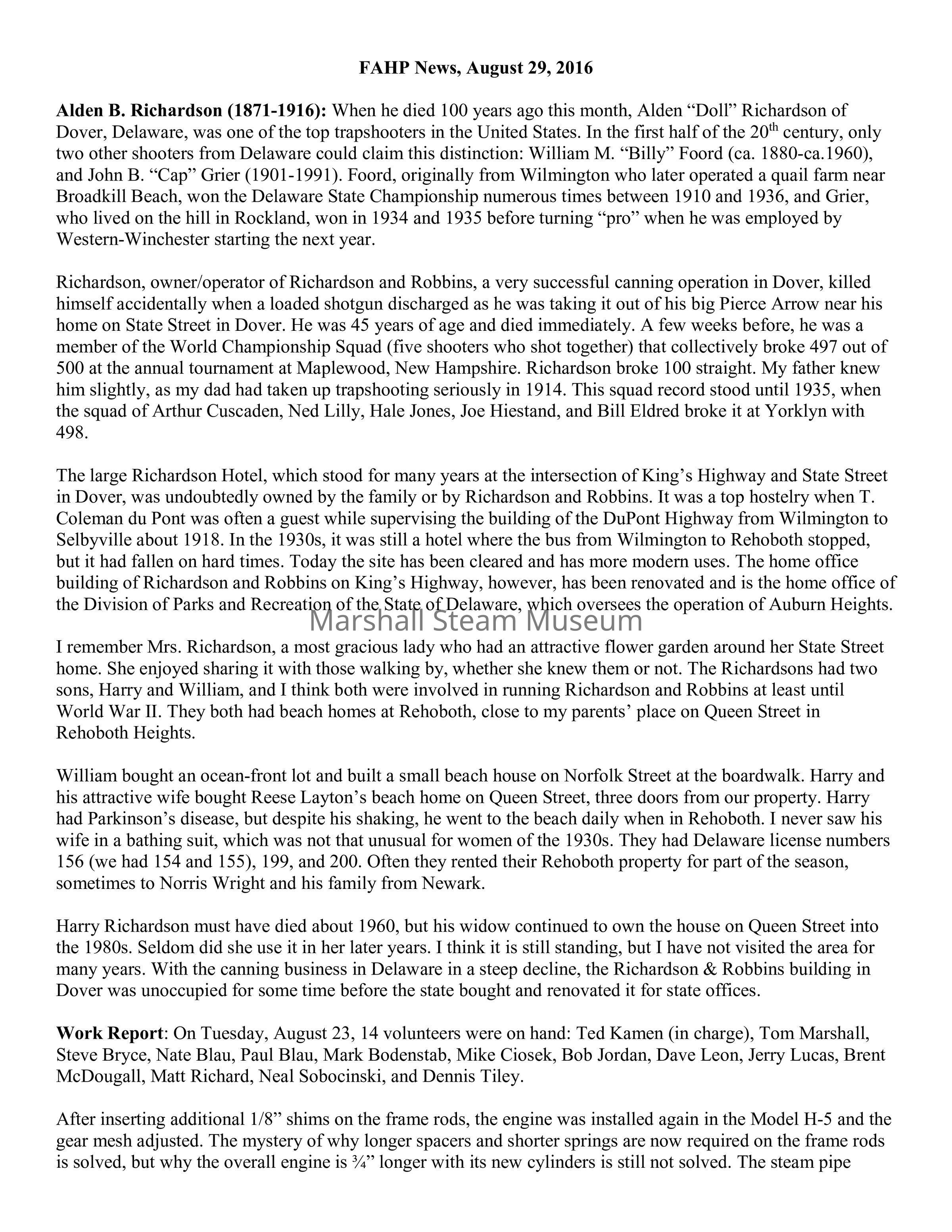 Harry Richardson must have died about 1960, but his widow continued to own the house on Queen Street into the 1980s. Seldom did she use it in her later years. I think it is still standing, but I have not visited the area for many years. With the canning business in Delaware in a steep decline, the Richardson & Robbins building in Dover was unoccupied for some time before the state bought and renovated it for state offices.