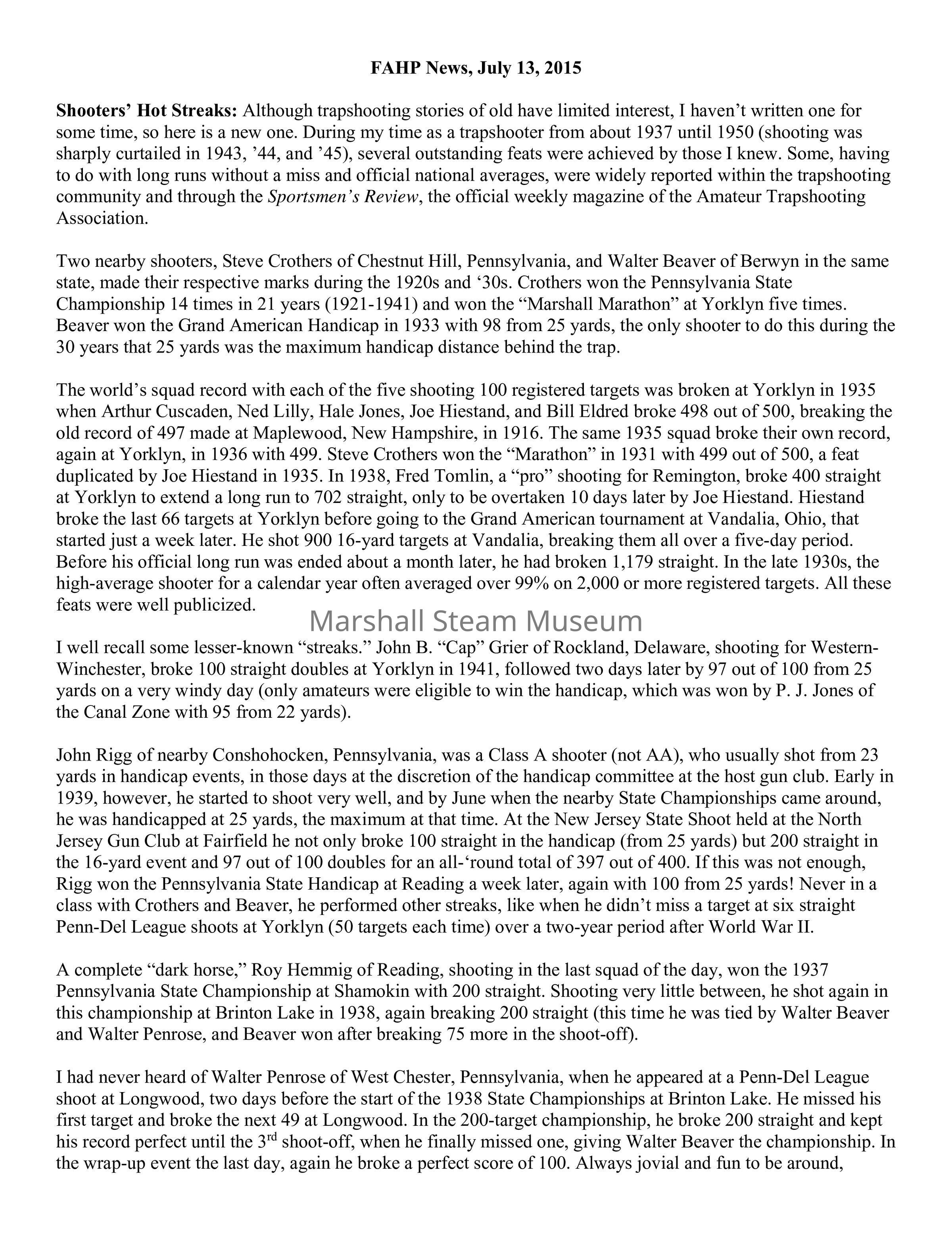 Shooters’ Hot Streaks: Although trapshooting stories of old have limited interest, I haven’t written one for some time, so here is a new one. During my time as a trapshooter from about 1937 until 1950 (shooting was sharply curtailed in 1943, ’44, and ’45), several outstanding feats were achieved by those I knew. Some, having to do with long runs without a miss and official national averages, were widely reported within the trapshooting community and through the Sportsmen’s Review, the official weekly magazine of the Amateur Trapshooting Association.