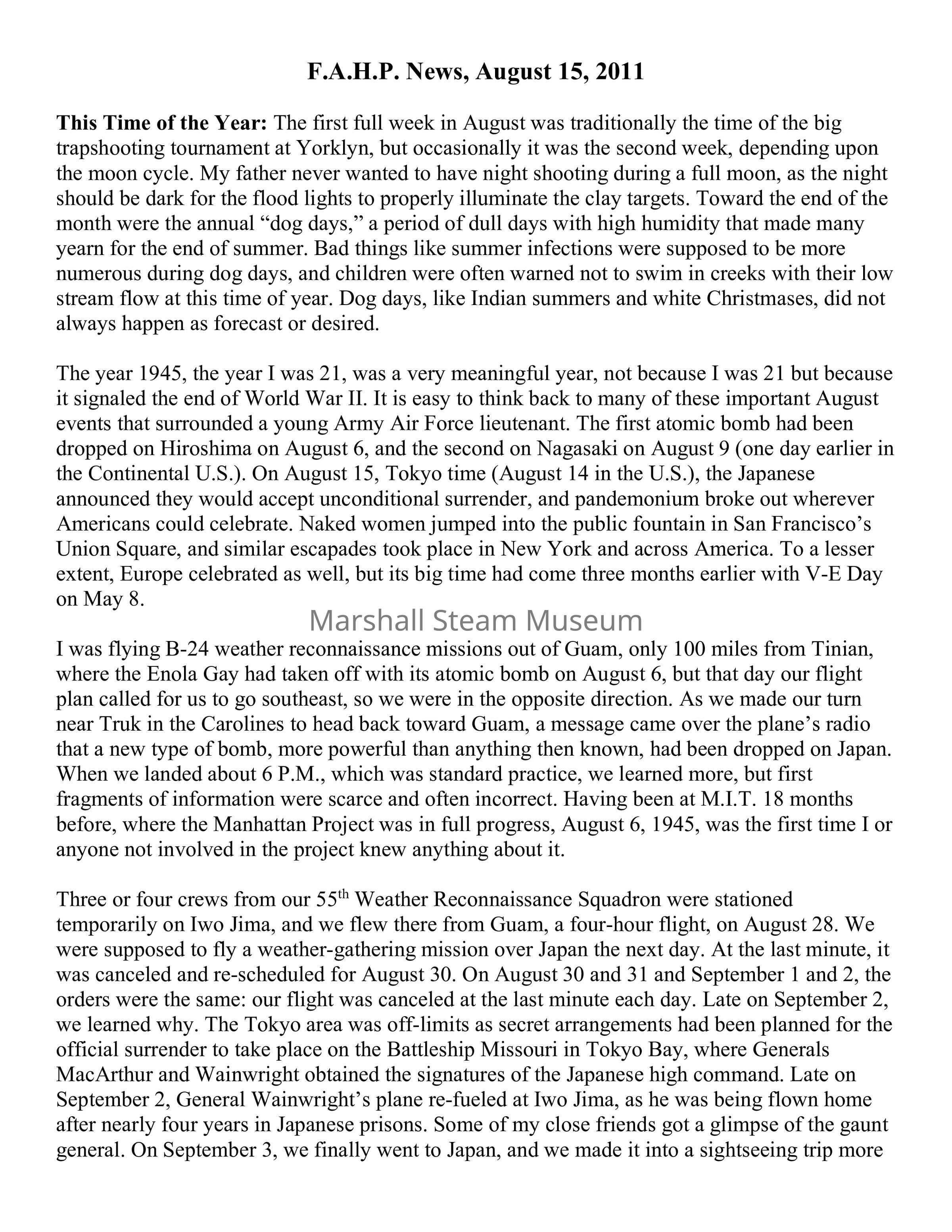 Three or four crews from our 55th Weather Reconnaissance Squadron were stationed temporarily on Iwo Jima, and we flew there from Guam, a four-hour flight, on August 28. We were supposed to fly a weather-gathering mission over Japan the next day. At the last minute, it was canceled and re-scheduled for August 30. On August 30 and 31 and September 1 and 2, the orders were the same: our flight was canceled at the last minute each day. Late on September 2, we learned why. The Tokyo area was off-limits as secret arrangements had been planned for the official surrender to take place on the Battleship Missouri in Tokyo Bay, where Generals MacArthur and Wainwright obtained the signatures of the Japanese high command. Late on September 2, General Wainwright’s plane re-fueled at Iwo Jima, as he was being flown home after nearly four years in Japanese prisons. Some of my close friends got a glimpse of the gaunt general. On September 3, we finally went to Japan, and we made it into a sightseeing trip more than a weather-gathering mission, flying low over Tokyo right up to the front of the Imperial Palace and finally to Hiroshima, where the cloud cover prevented us from seeing the devastation. We had been in the air 14 hours when we landed at Iwo well after dark. None of my other military experiences quite equaled this day.