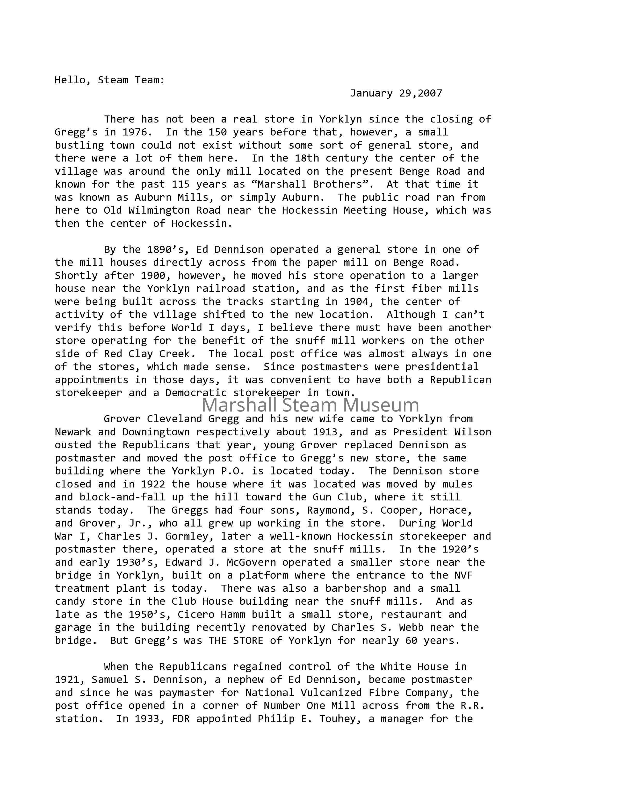 By the 1890’s, Ed Dennison operated a general store in one of the mill houses directly across from the paper mill on Benge Road. Shortly after 1900, however, he moved his store operation to a larger house near the Yorklyn railroad station, and as the first fiber mills were being built across the tracks starting in 1904, the center of activity of the village shifted to the new location. Although I can’t verify this before World I days, I believe there must have been another store operating for the benefit of the snuff mill workers on the other side of Red Clay Creek. The local post office was almost always in one of the stores, which made sense. Since postmasters were presidential appointments in those days, it was convenient to have both a Republican storekeeper and a Democratic storekeeper in town.