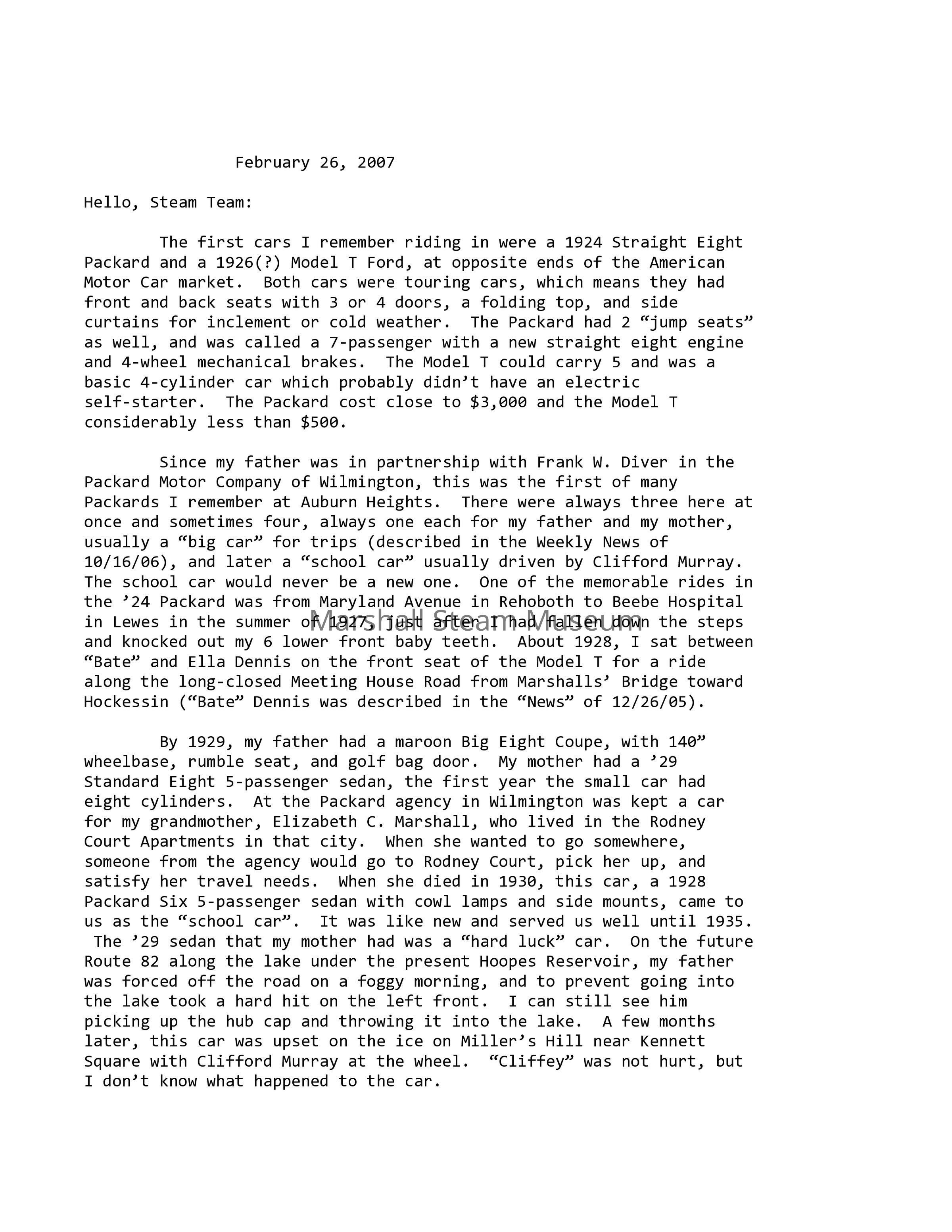 Since my father was in partnership with Frank W. Diver in the Packard Motor Company of Wilmington, this was the first of many Packards I remember at Auburn Heights. There were always three here at once and sometimes four, always one each for my father and my mother, usually a “big car” for trips (described in the Weekly News of 10/16/06), and later a “school car” usually driven by Clifford Murray. The school car would never be a new one. One of the memorable rides in the ’24 Packard was from Maryland Avenue in Rehoboth to Beebe Hospital in Lewes in the summer of 1927, just after I had fallen down the steps and knocked out my 6 lower front baby teeth. About 1928, I sat between “Bate” and Ella Dennis on the front seat of the Model T for a ride along the long-closed Meeting House Road from Marshalls’ Bridge toward Hockessin (“Bate” Dennis was described in the “News” of 12/26/05).