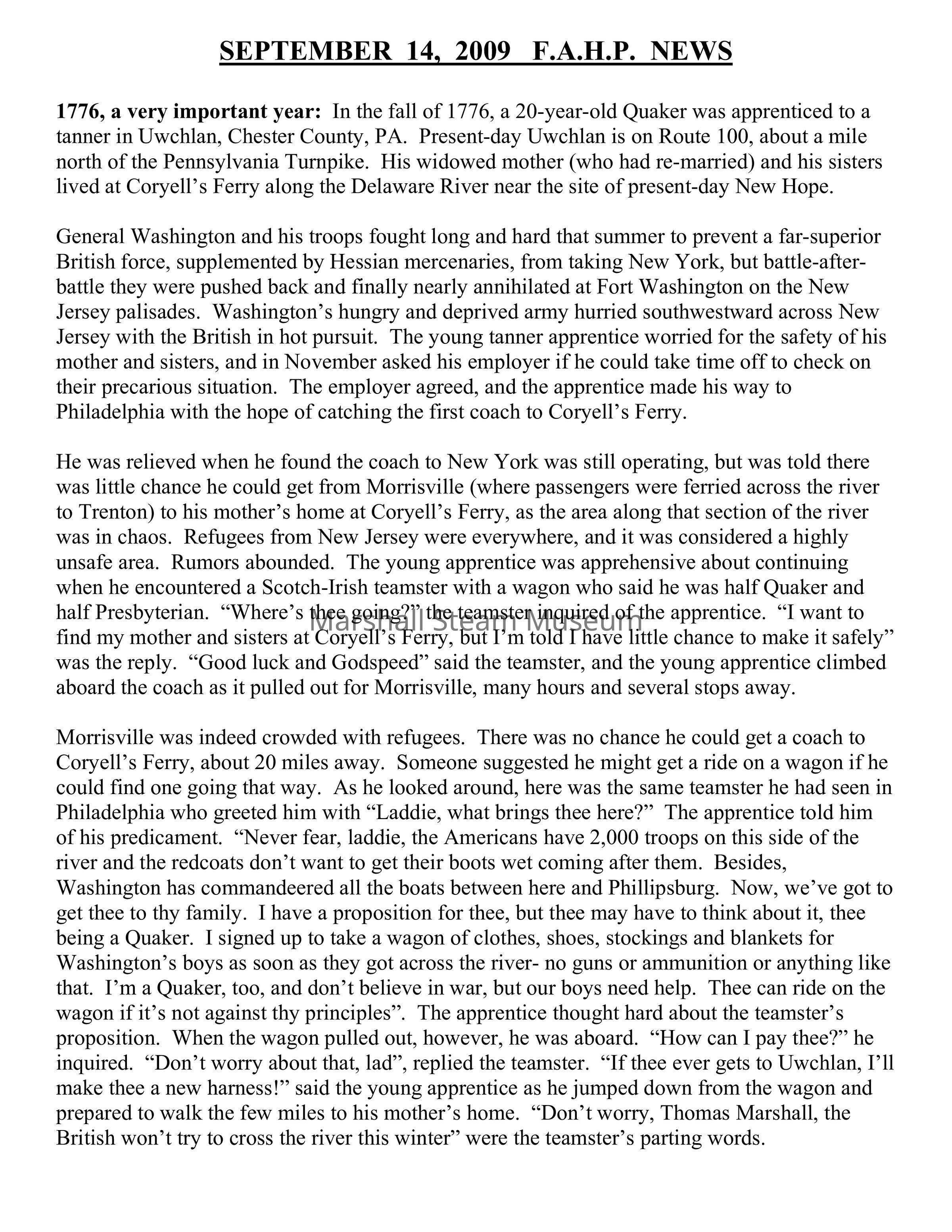 Morrisville was indeed crowded with refugees. There was no chance he could get a coach to Coryell’s Ferry, about 20 miles away. Someone suggested he might get a ride on a wagon if he could find one going that way. As he looked around, here was the same teamster he had seen in Philadelphia who greeted him with “Laddie, what brings thee here?” The apprentice told him of his predicament. “Never fear, laddie, the Americans have 2,000 troops on this side of the river and the redcoats don’t want to get their boots wet coming after them. Besides, Washington has commandeered all the boats between here and Phillipsburg. Now, we’ve got to get thee to thy family. I have a proposition for thee, but thee may have to think about it, thee being a Quaker. I signed up to take a wagon of clothes, shoes, stockings and blankets for Washington’s boys as soon as they got across the river- no guns or ammunition or anything like that. I’m a Quaker, too, and don’t believe in war, but our boys need help. Thee can ride on the wagon if it’s not against thy principles”. The apprentice thought hard about the teamster’s proposition. When the wagon pulled out, however, he was aboard. “How can I pay thee?” he inquired. “Don’t worry about that, lad”, replied the teamster. “If thee ever gets to Uwchlan, I’ll make thee a new harness!” said the young apprentice as he jumped down from the wagon and prepared to walk the few miles to his mother’s home. “Don’t worry, Thomas Marshall, the British won’t try to cross the river this winter” were the teamster’s parting words.