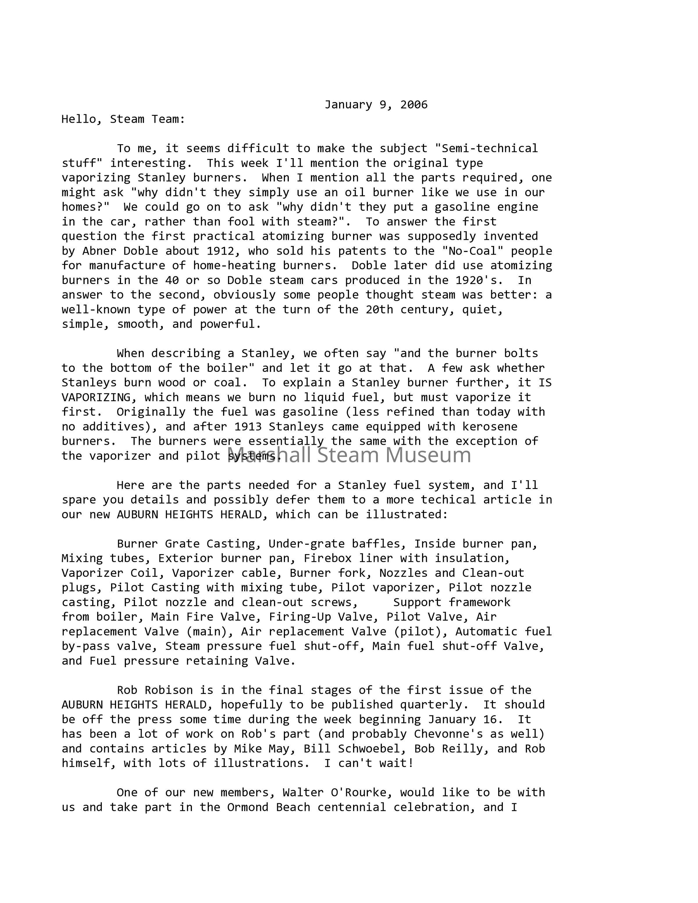 To me, it seems difficult to make the subject "Semi-technical stuff" interesting. This week I'll mention the original type vaporizing Stanley burners. When I mention all the parts required, one might ask "why didn't they simply use an oil burner like we use in our homes?" We could go on to ask "why didn't they put a gasoline engine in the car, rather than fool with steam?". To answer the first question the first practical atomizing burner was supposedly invented by Abner Doble about 1912, who sold his patents to the "No-Coal" people for manufacture of home-heating burners. Doble later did use atomizing burners in the 40 or so Doble steam cars produced in the 1920's. In answer to the second, obviously some people thought steam was better: a well-known type of power at the turn of the 20th century, quiet, simple, smooth, and powerful.