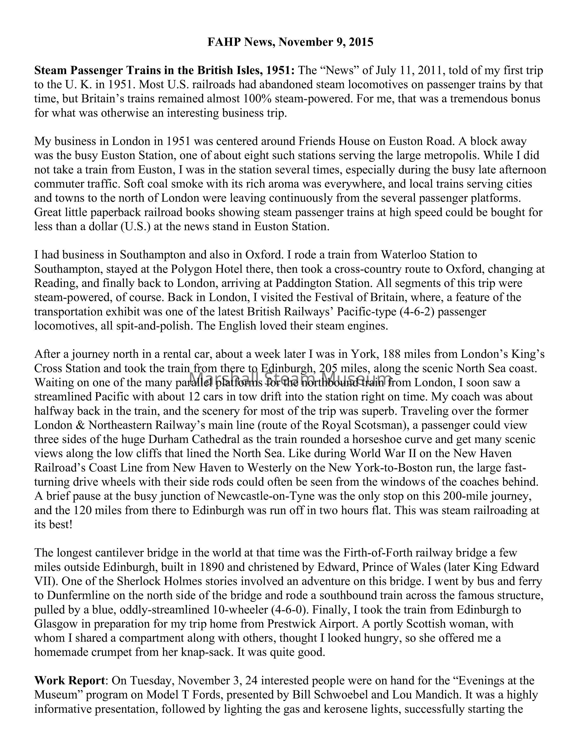 Work Report: On Tuesday, November 3, 24 interested people were on hand for the “Evenings at the Museum” program on Model T Fords, presented by Bill Schwoebel and Lou Mandich. It was a highly informative presentation, followed by lighting the gas and kerosene lights, successfully starting the Model T on the first attempt and giving rides around the grounds on an Indian summer night. Including the work session that also took place, the following 17 volunteers were on hand: Steve Bryce (in charge), Brent McDougall, Anne Cleary, Rose Ann Hoover, Dave Leon, John Bacino, Jerry Novak, Ted Kamen, Jeff Pollock, Dennis Dragon, Bob Stransky, Tom Marshall, Richard Bernard, Pete Parlett, Jerry Lucas, Bill Rule, and Ed Paschall.