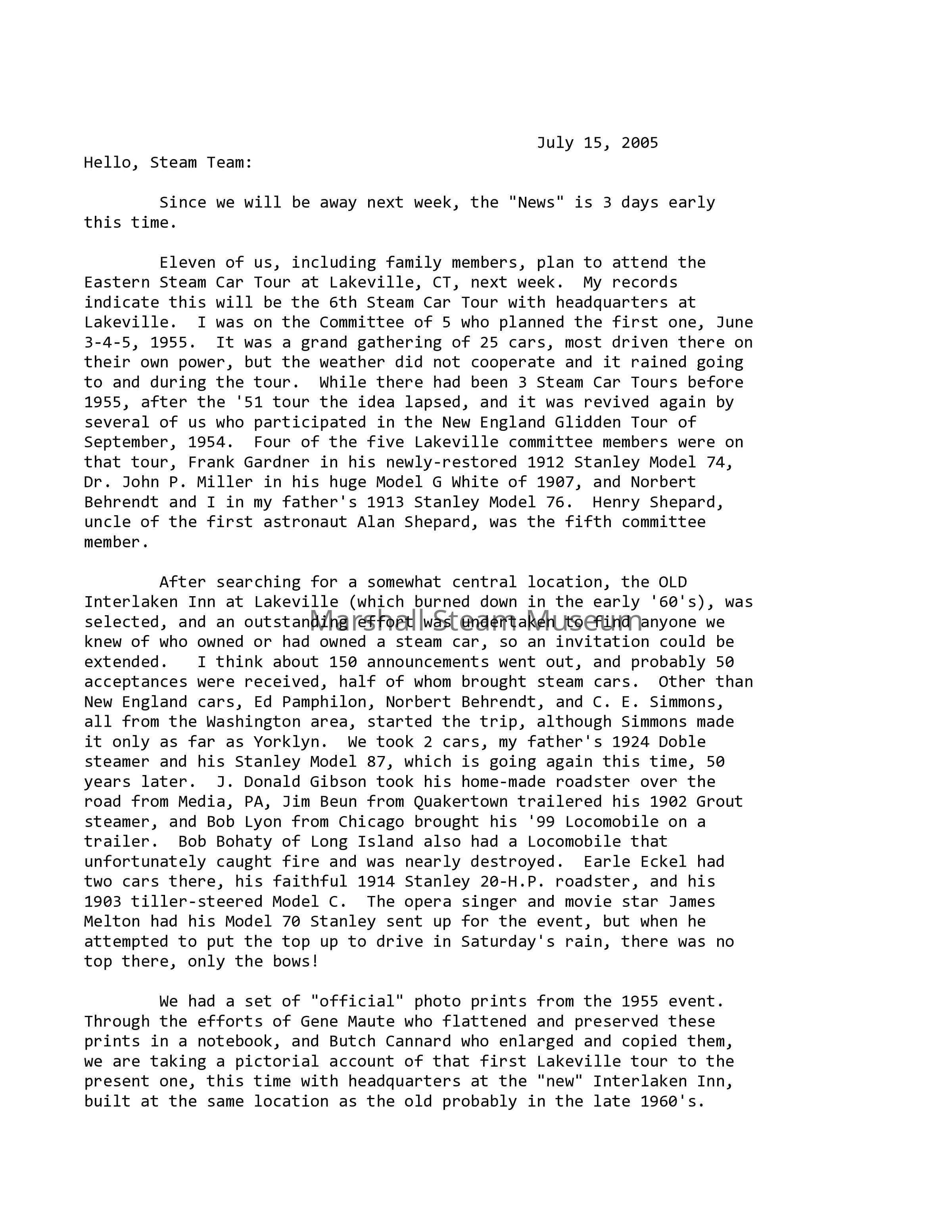 Eleven of us, including family members, plan to attend the Eastern Steam Car Tour at Lakeville, CT, next week. My records indicate this will be the 6th Steam Car Tour with headquarters at Lakeville. I was on the Committee of 5 who planned the first one, June 3-4-5, 1955. It was a grand gathering of 25 cars, most driven there on their own power, but the weather did not cooperate, and it rained going to and during the tour. While there had been 3 Steam Car Tours before 1955, after the '51 tour the idea lapsed, and it was revived again by several of us who participated in the New England Glidden Tour of September, 1954. Four of the five Lakeville committee members were on that tour, Frank Gardner in his newly-restored 1912 Stanley Model 74, Dr. John P. Miller in his huge Model G White of 1907, and Norbert Behrendt and I in my father's 1913 Stanley Model 76. Henry Shepard, uncle of the first astronaut Alan Shepard, was the fifth committee member.