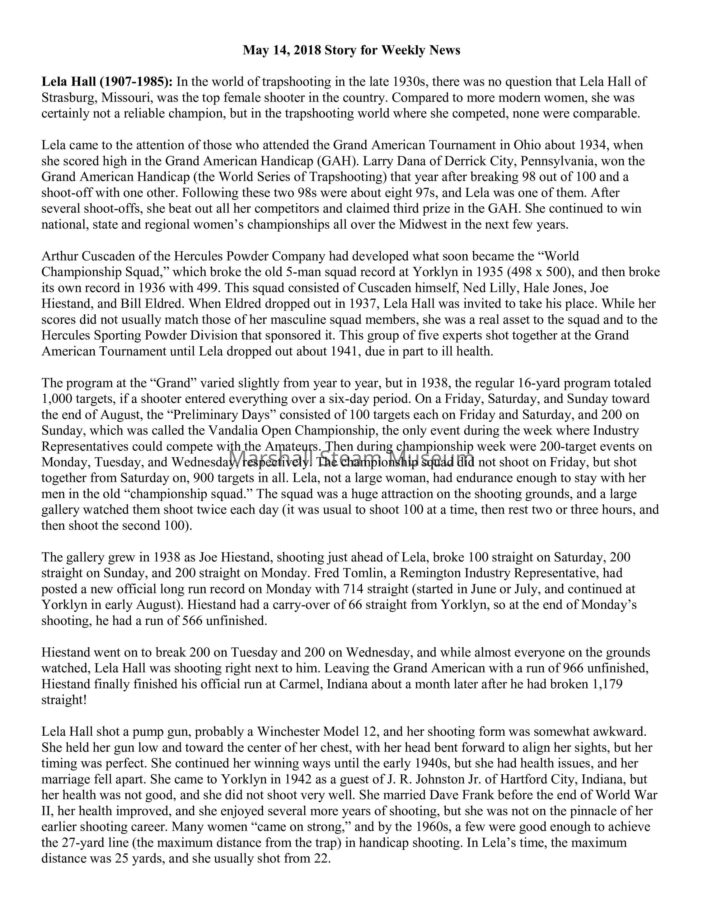 Lela Hall (1907-1985): In the world of trapshooting in the late 1930s, there was no question that Lela Hall of Strasburg, Missouri, was the top female shooter in the country. Compared to more modern women, she was certainly not a reliable champion, but in the trapshooting world where she competed, none were comparable.