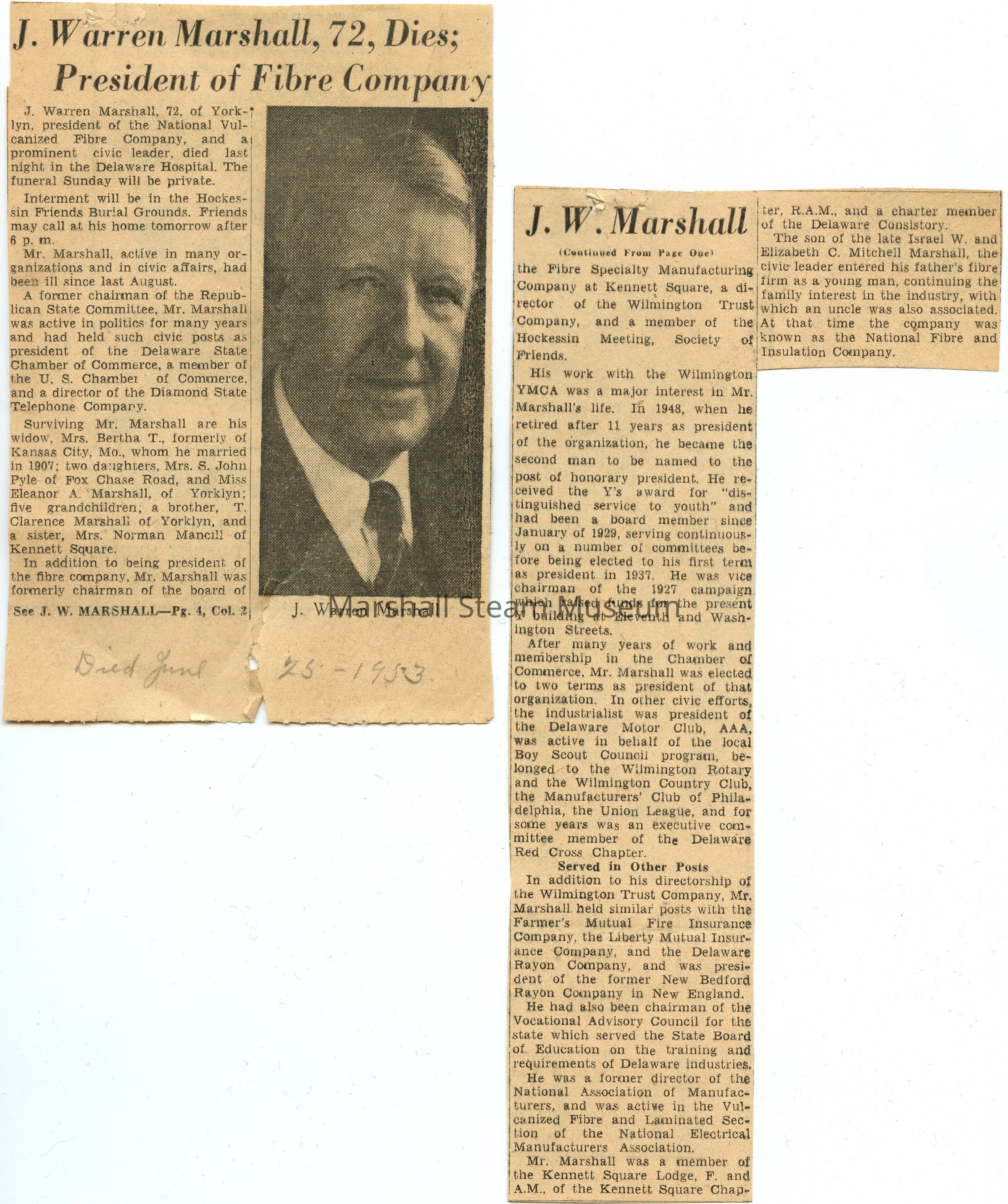 Newspaper clippings describing J. Warren Marshall, 72, of Yorklyn, president of the National Vulcanized Fibre Company died June 25, 1953