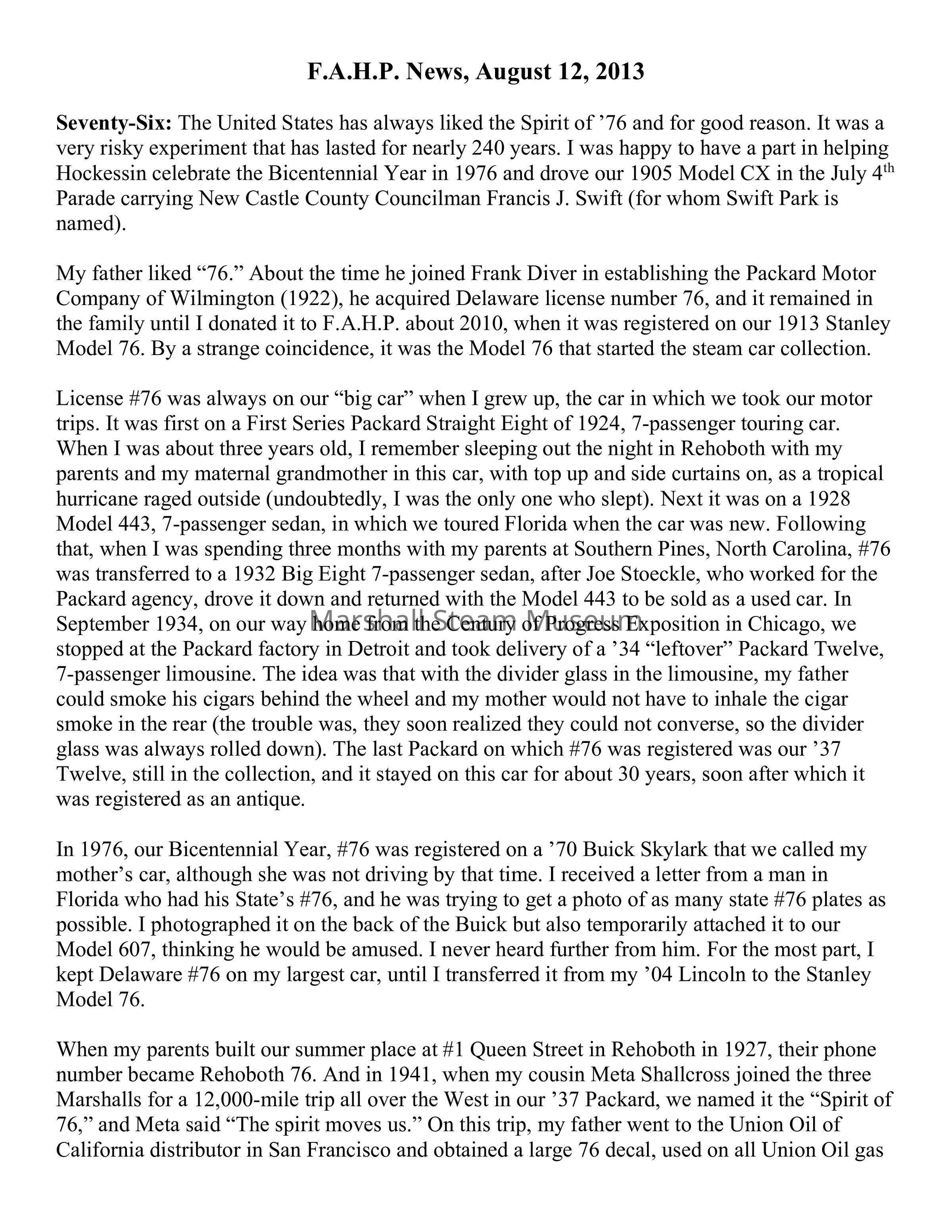 My father liked “76.” About the time he joined Frank Diver in establishing the Packard Motor Company of Wilmington (1922), he acquired Delaware license number 76, and it remained in the family until I donated it to F.A.H.P. about 2010, when it was registered on our 1913 Stanley Model 76. By a strange coincidence, it was the Model 76 that started the steam car collection.