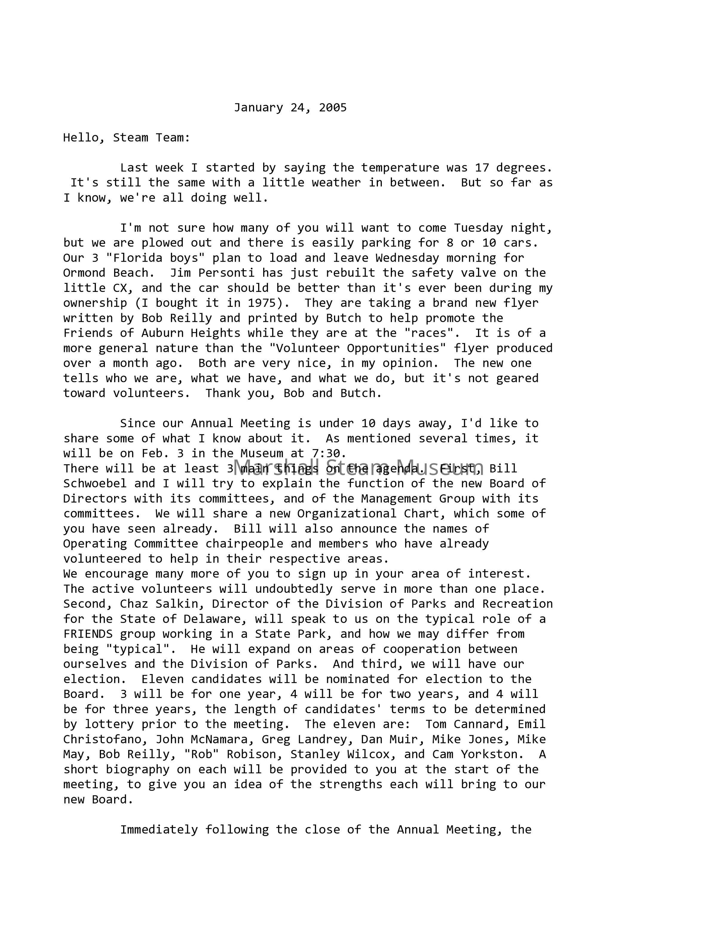 Since our Annual Meeting is under 10 days away, I'd like to share some of what I know about it. As mentioned several times, it will be on Feb. 3 in the Museum at 7:30. There will be at least 3 main things on the agenda. First, Bill Schwoebel and I will try to explain the function of the new Board of Directors with its committees, and of the Management Group with its committees. We will share a new Organizational Chart, which some of you have seen already. Bill will also announce the names of Operating Committee chairpeople and members who have already volunteered to help in their respective areas. We encourage many more of you to sign up in your area of interest. The active volunteers will undoubtedly serve in more than one place. Second, Chaz Salkin, Director of the Division of Parks and Recreation for the State of Delaware, will speak to us on the typical role of a FRIENDS group working in a State Park, and how we may differ from being "typical". He will expand on areas of cooperation between ourselves and the Division of Parks. And third, we will have our election. Eleven candidates will be nominated for election to the Board. 3 will be for one year, 4 will be for two years, and 4 will be for three years, the length of candidates' terms to be determined by lottery prior to the meeting. The eleven are: Tom Cannard, Emil Christofano, John McNamara, Greg Landrey, Dan Muir, Mike Jones, Mike May, Bob Reilly, "Rob" Robison, Stanley Wilcox, and Cam Yorkston. A short biography on each will be provided to you at the start of the meeting, to give you an idea of the strengths each will bring to our new Board.