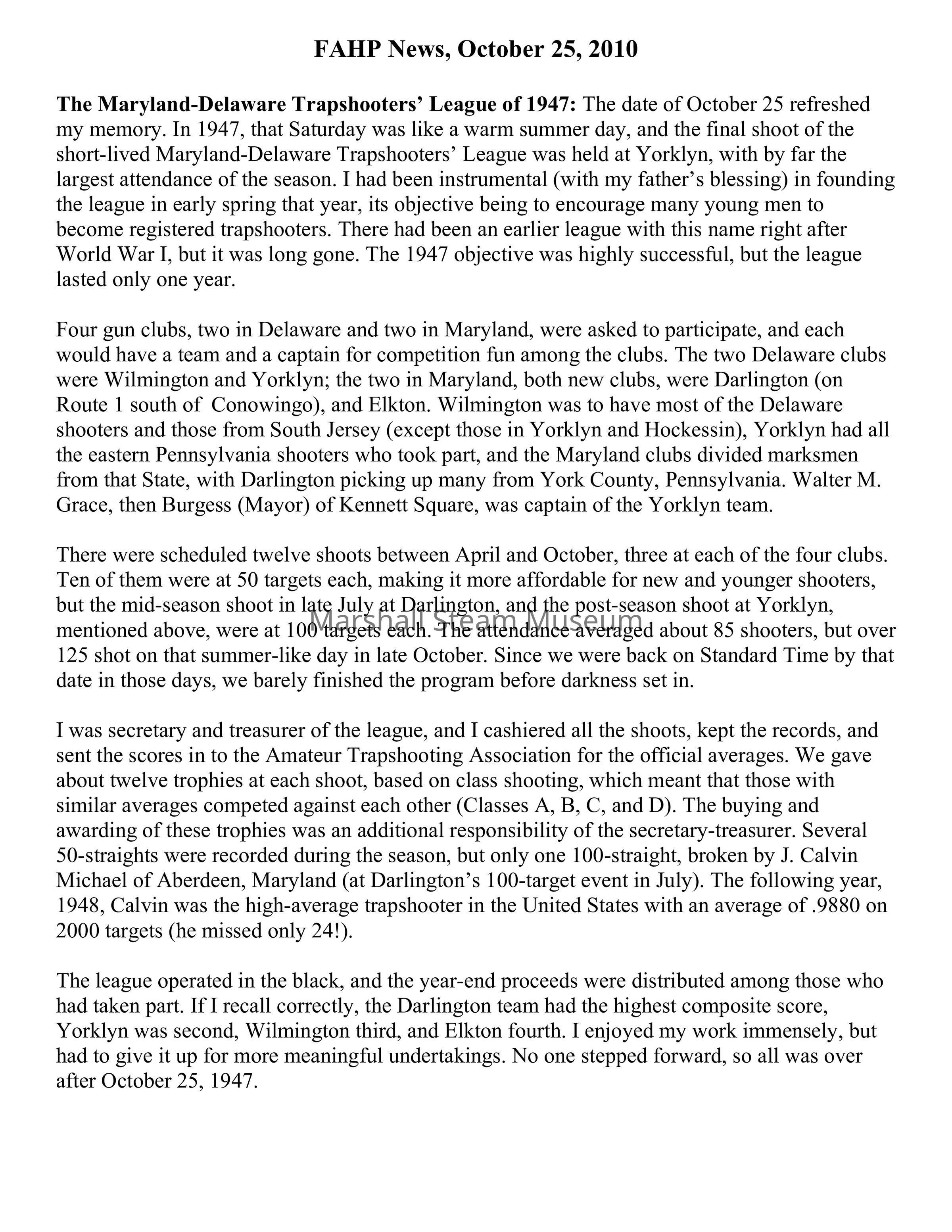 The Maryland-Delaware Trapshooters’ League of 1947: The date of October 25 refreshed my memory. In 1947, that Saturday was like a warm summer day, and the final shoot of the short-lived Maryland-Delaware Trapshooters’ League was held at Yorklyn, with by far the largest attendance of the season. I had been instrumental (with my father’s blessing) in founding the league in early spring that year, its objective being to encourage many young men to become registered trapshooters. There had been an earlier league with this name right after World War I, but it was long gone. The 1947 objective was highly successful, but the league lasted only one year.