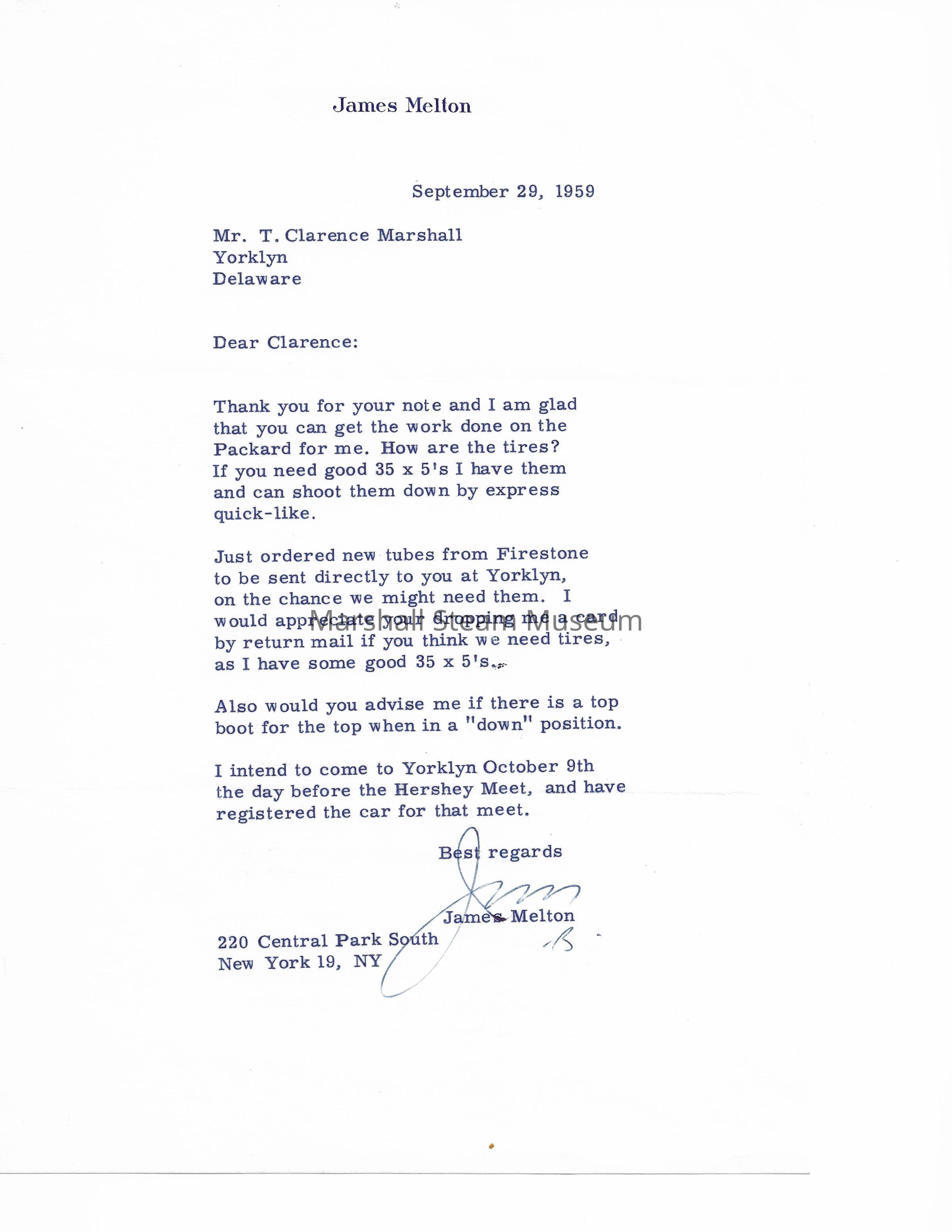 1959 letter from James Melton to T Clarence Marshall regarding repair on Melton's Packard