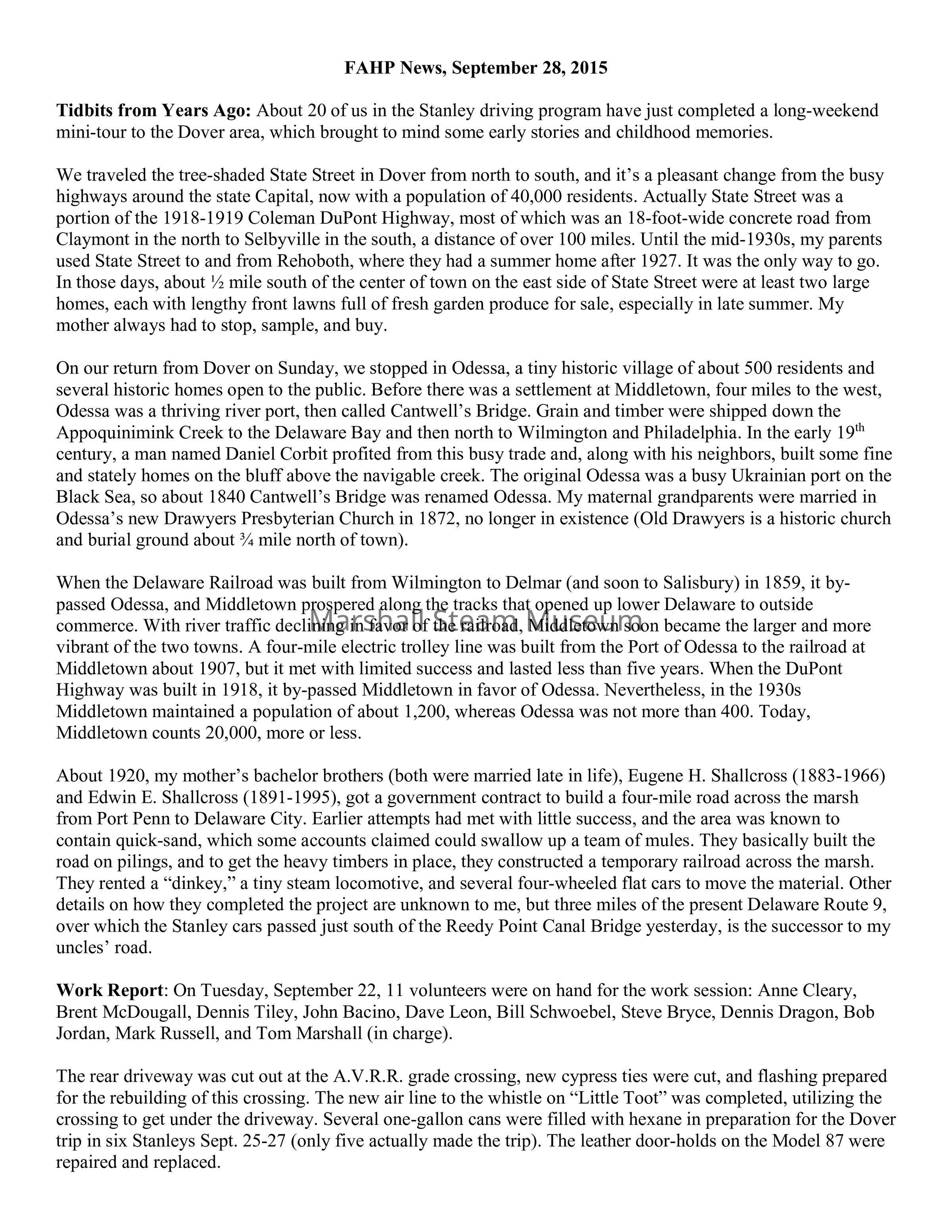 Tidbits from Years Ago: About 20 of us in the Stanley driving program have just completed a long-weekend mini-tour to the Dover area, which brought to mind some early stories and childhood memories.