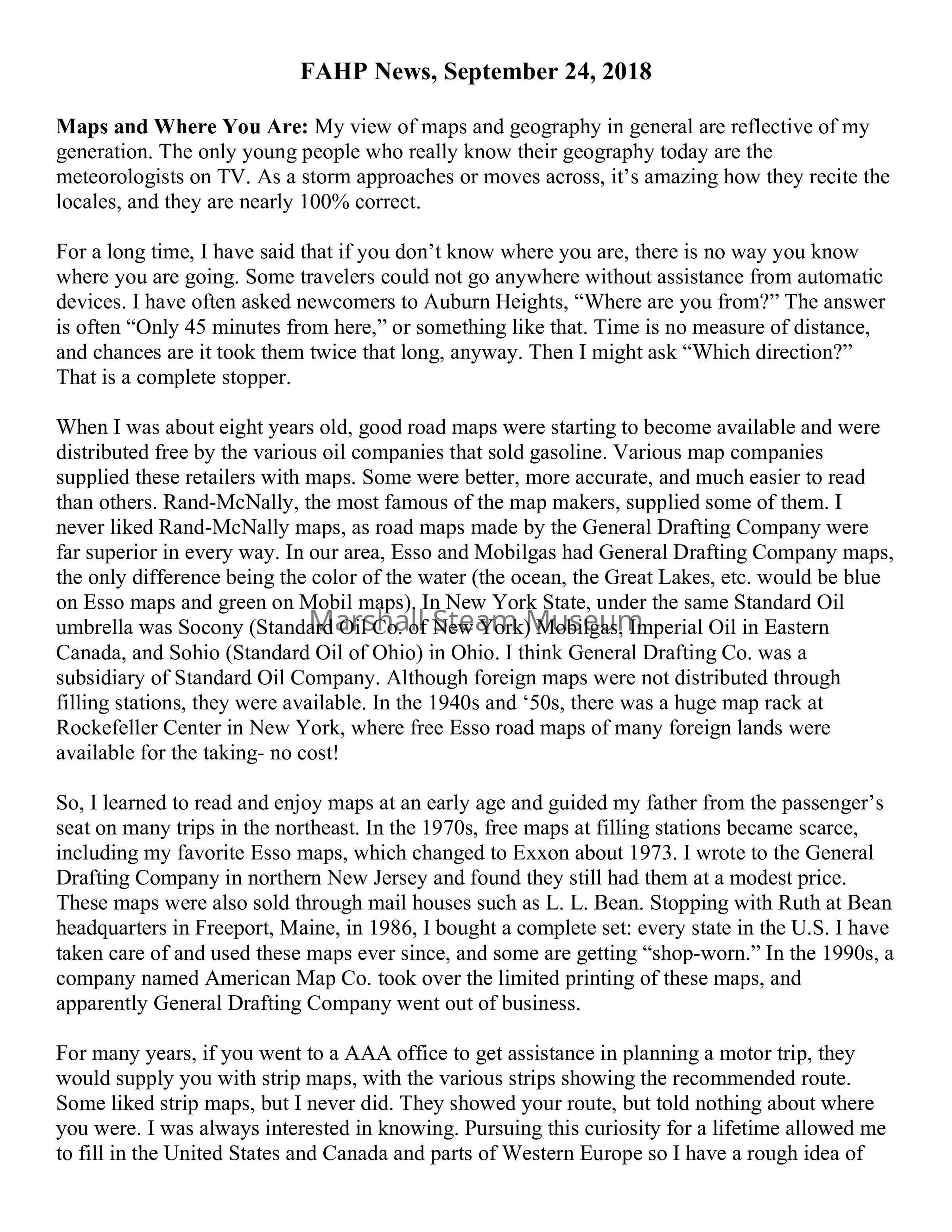 So, I learned to read and enjoy maps at an early age and guided my father from the passenger’s seat on many trips in the northeast. In the 1970s, free maps at filling stations became scarce, including my favorite Esso maps, which changed to Exxon about 1973. I wrote to the General Drafting Company in northern New Jersey and found they still had them at a modest price. These maps were also sold through mail houses such as L. L. Bean. Stopping with Ruth at Bean headquarters in Freeport, Maine, in 1986, I bought a complete set: every state in the U.S. I have taken care of and used these maps ever since, and some are getting “shop-worn.” In the 1990s, a company named American Map Co. took over the limited printing of these maps, and apparently General Drafting Company went out of business.