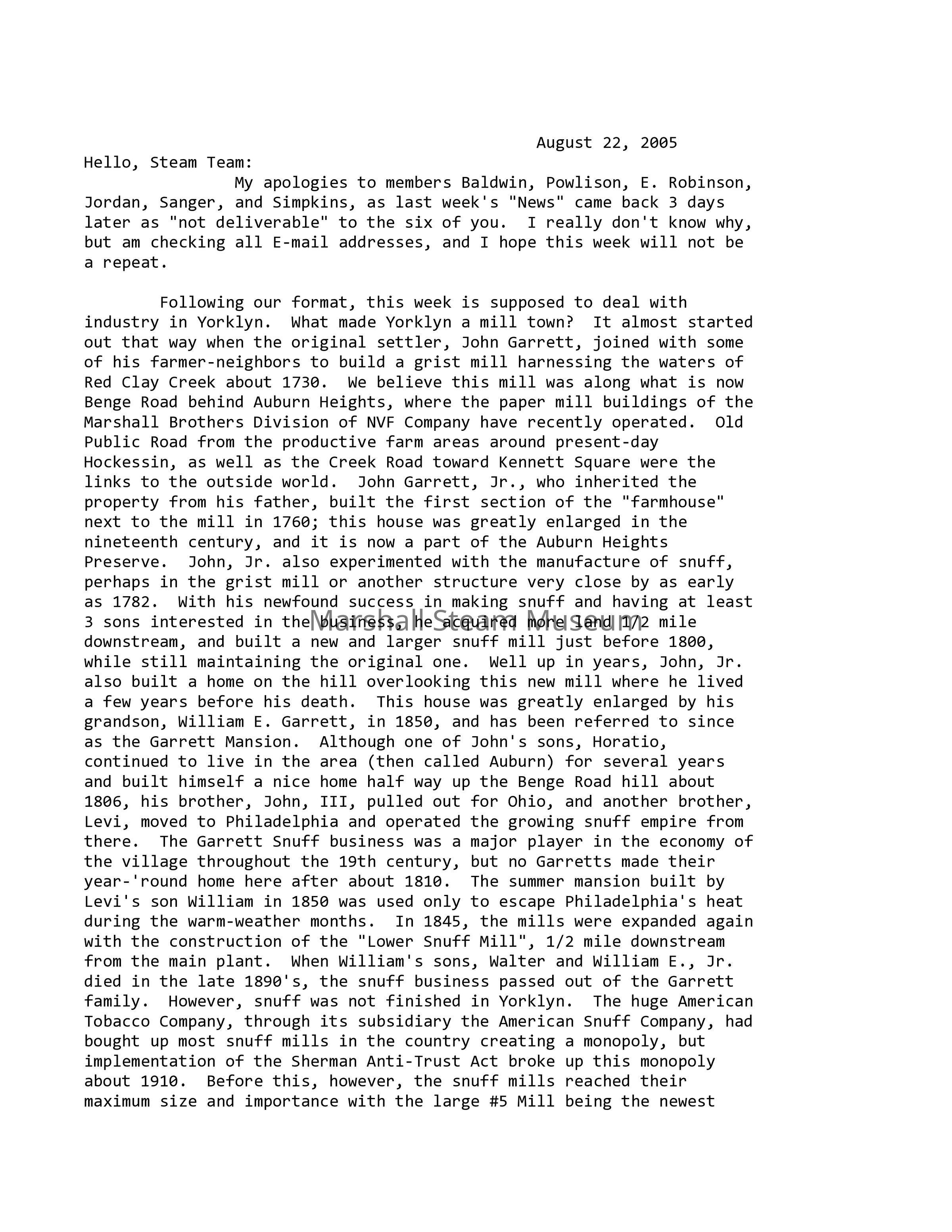 Following our format, this week is supposed to deal with industry in Yorklyn. What made Yorklyn a mill town? It almost started out that way when the original settler, John Garrett, joined with some of his farmer-neighbors to build a grist mill harnessing the waters of Red Clay Creek about 1730. We believe this mill was along what is now Benge Road behind Auburn Heights, where the paper mill buildings of the Marshall Brothers Division of NVF Company have recently operated. Old Public Road from the productive farm areas around present-day Hockessin, as well as the Creek Road toward Kennett Square were the links to the outside world. John Garrett, Jr., who inherited the property from his father, built the first section of the "farmhouse" next to the mill in 1760; this house was greatly enlarged in the nineteenth century, and it is now a part of the Auburn Heights Preserve. John, Jr. also experimented with the manufacture of snuff, perhaps in the grist mill or another structure very close by as early as 1782. With his newfound success in making snuff and having at least 3 sons interested in the business, he acquired more land 1/2 mile downstream, and built a new and larger snuff mill just before 1800, while still maintaining the original one. Well up in years, John, Jr. also built a home on the hill overlooking this new mill where he lived a few years before his death. This house was greatly enlarged by his grandson, William E. Garrett, in 1850, and has been referred to since as the Garrett Mansion. Although one of John's sons, Horatio, continued to live in the area (then called Auburn) for several years and built himself a nice home half way up the Benge Road hill about 1806, his brother, John, III, pulled out for Ohio, and another brother, Levi, moved to Philadelphia and operated the growing snuff empire from there. The Garrett Snuff business was a major player in the economy of the village throughout the 19th century, but no Garretts made their year-'round home here after about 1810. The summer mansion built by Levi's son William in 1850 was used only to escape Philadelphia's heat during the warm-weather months. In 1845, the mills were expanded again with the construction of the "Lower Snuff Mill", 1/2 mile downstream from the main plant. When William's sons, Walter and William E., Jr. died in the late 1890's, the snuff business passed out of the Garrett family. However, snuff was not finished in Yorklyn. The huge American Tobacco Company, through its subsidiary the American Snuff Company, had bought up most snuff mills in the country creating a monopoly, but implementation of the Sherman Anti-Trust Act broke up this monopoly about 1910. Before this, however, the snuff mills reached their maximum size and importance with the large #5 Mill being the newest addition (1902). After 1910, the Yorklyn mills were sharply down-sized and came under the ownership of the George W. Helme Company of Helmetta, NJ. Snuff was manufactured here with 40 employees until the mills were closed down by Helme in 1954. (More on Industry later).