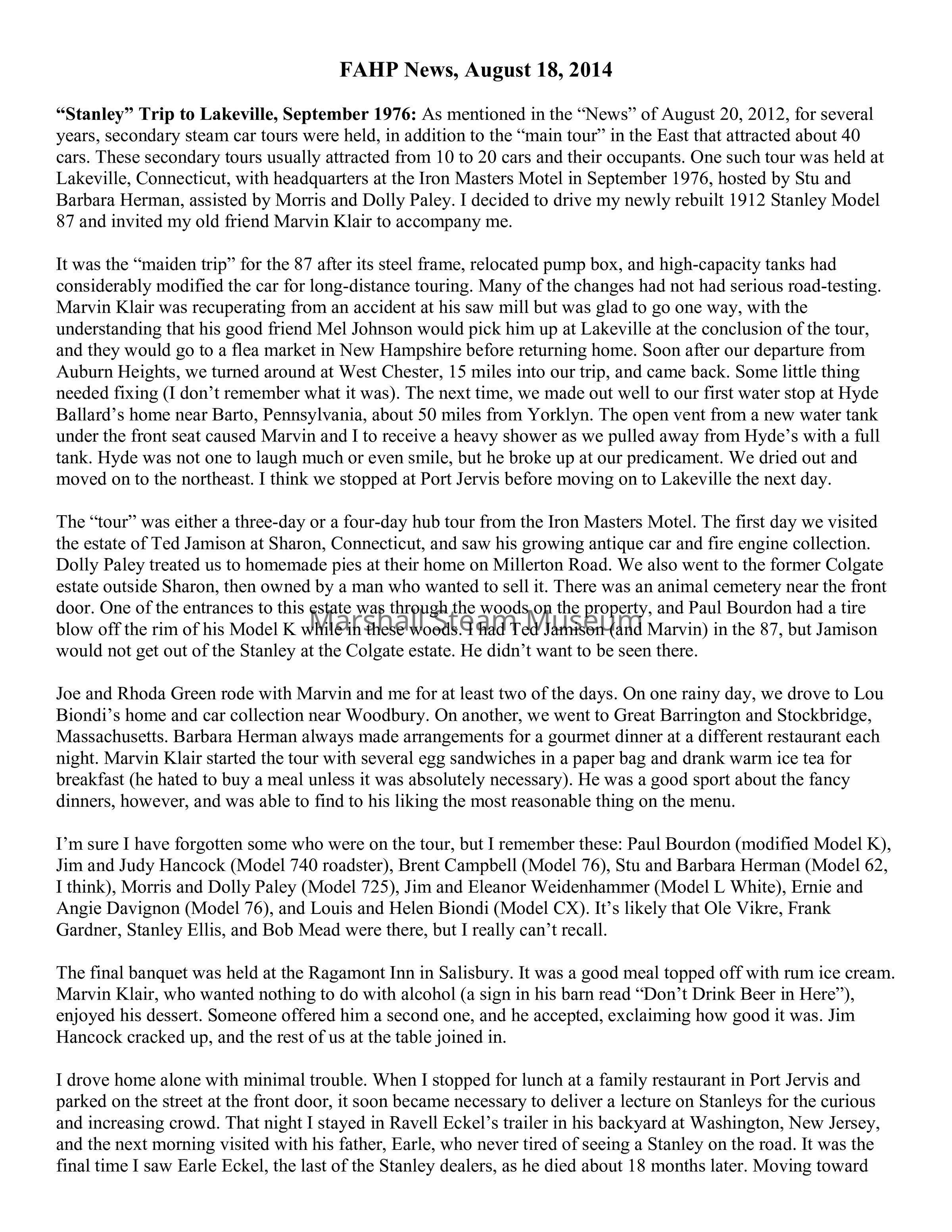The “tour” was either a three-day or a four-day hub tour from the Iron Masters Motel. The first day we visited the estate of Ted Jamison at Sharon, Connecticut, and saw his growing antique car and fire engine collection. Dolly Paley treated us to homemade pies at their home on Millerton Road. We also went to the former Colgate estate outside Sharon, then owned by a man who wanted to sell it. There was an animal cemetery near the front door. One of the entrances to this estate was through the woods on the property, and Paul Bourdon had a tire blow off the rim of his Model K while in these woods. I had Ted Jamison (and Marvin) in the 87, but Jamison would not get out of the Stanley at the Colgate estate. He didn’t want to be seen there.
