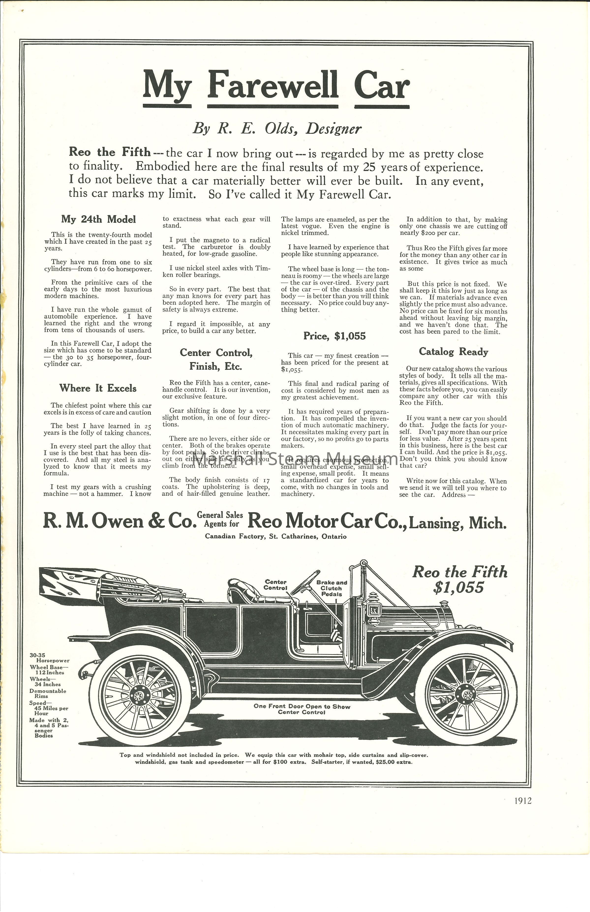1912 advertisement for REO Motor scanned excerpt from "The Poster Book of Antique Auto Ads" by Howard Garrett