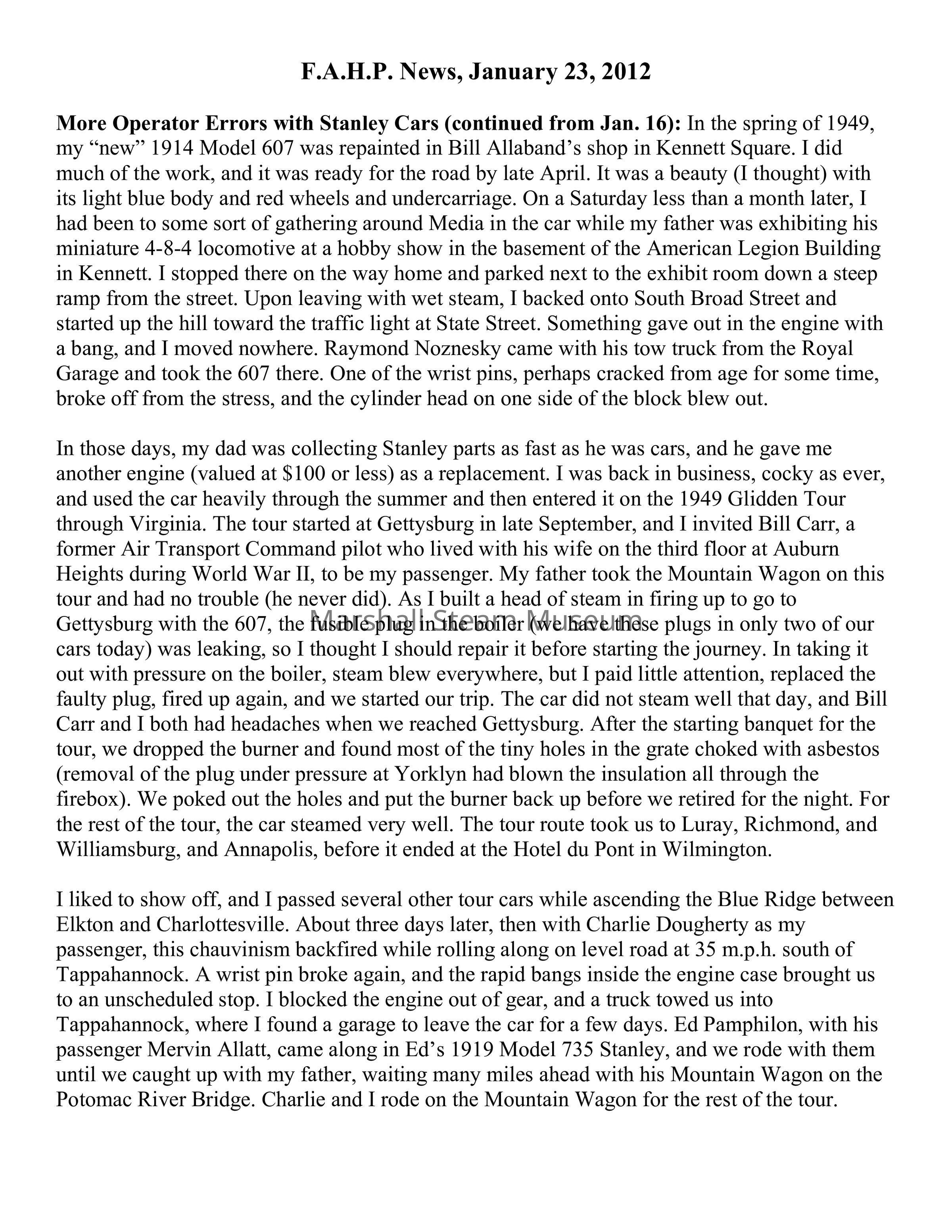 In those days, my dad was collecting Stanley parts as fast as he was cars, and he gave me another engine (valued at $100 or less) as a replacement. I was back in business, cocky as ever, and used the car heavily through the summer and then entered it on the 1949 Glidden Tour through Virginia. The tour started at Gettysburg in late September, and I invited Bill Carr, a former Air Transport Command pilot who lived with his wife on the third floor at Auburn Heights during World War II, to be my passenger. My father took the Mountain Wagon on this tour and had no trouble (he never did). As I built a head of steam in firing up to go to Gettysburg with the 607, the fusible plug in the boiler (we have these plugs in only two of our cars today) was leaking, so I thought I should repair it before starting the journey. In taking it out with pressure on the boiler, steam blew everywhere, but I paid little attention, replaced the faulty plug, fired up again, and we started our trip. The car did not steam well that day, and Bill Carr and I both had headaches when we reached Gettysburg. After the starting banquet for the tour, we dropped the burner and found most of the tiny holes in the grate choked with asbestos (removal of the plug under pressure at Yorklyn had blown the insulation all through the firebox). We poked out the holes and put the burner back up before we retired for the night. For the rest of the tour, the car steamed very well. The tour route took us to Luray, Richmond, and Williamsburg, and Annapolis, before it ended at the Hotel du Pont in Wilmington.