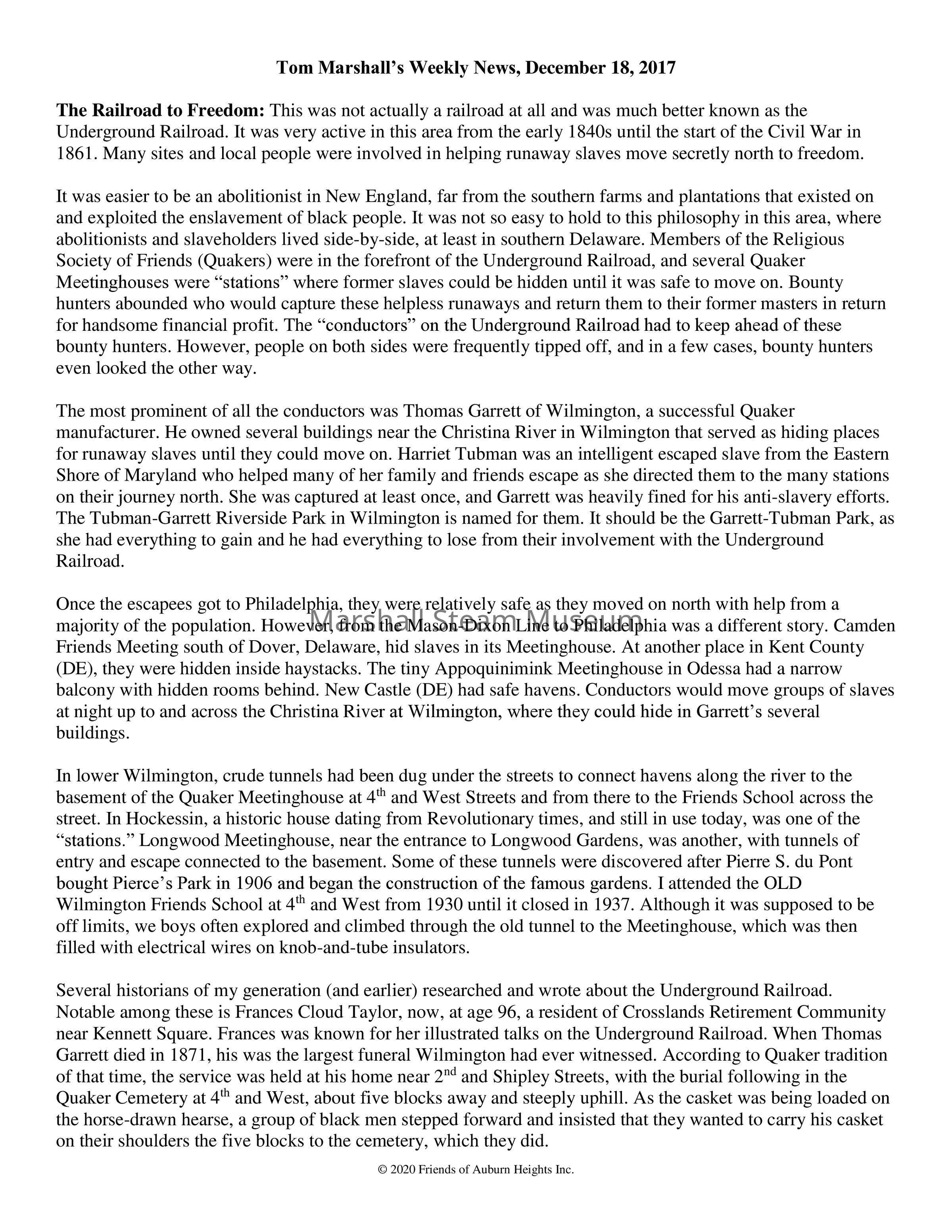 Several historians of my generation (and earlier) researched and wrote about the Underground Railroad. Notable among these is Frances Cloud Taylor, now, at age 96, a resident of Crosslands Retirement Community near Kennett Square. Frances was known for her illustrated talks on the Underground Railroad. When Thomas Garrett died in 1871, his was the largest funeral Wilmington had ever witnessed. According to Quaker tradition of that time, the service was held at his home near 2nd and Shipley Streets, with the burial following in the