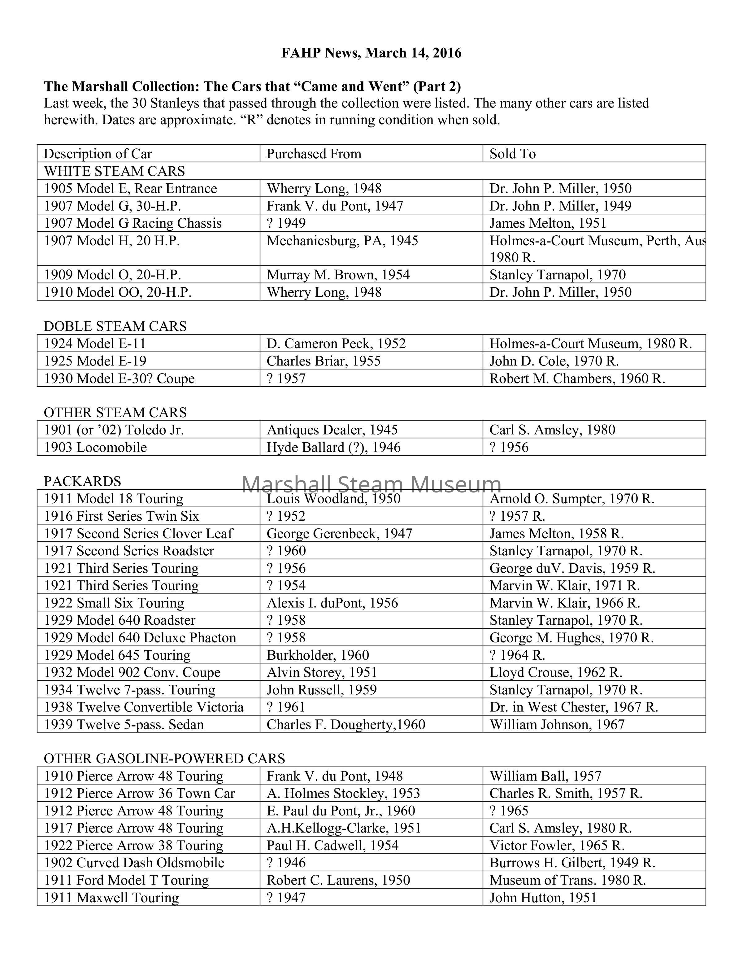 Last week, the 30 Stanleys that passed through the collection were listed. The many other cars are listed herewith. Dates are approximate. “R” denotes in running condition when sold.