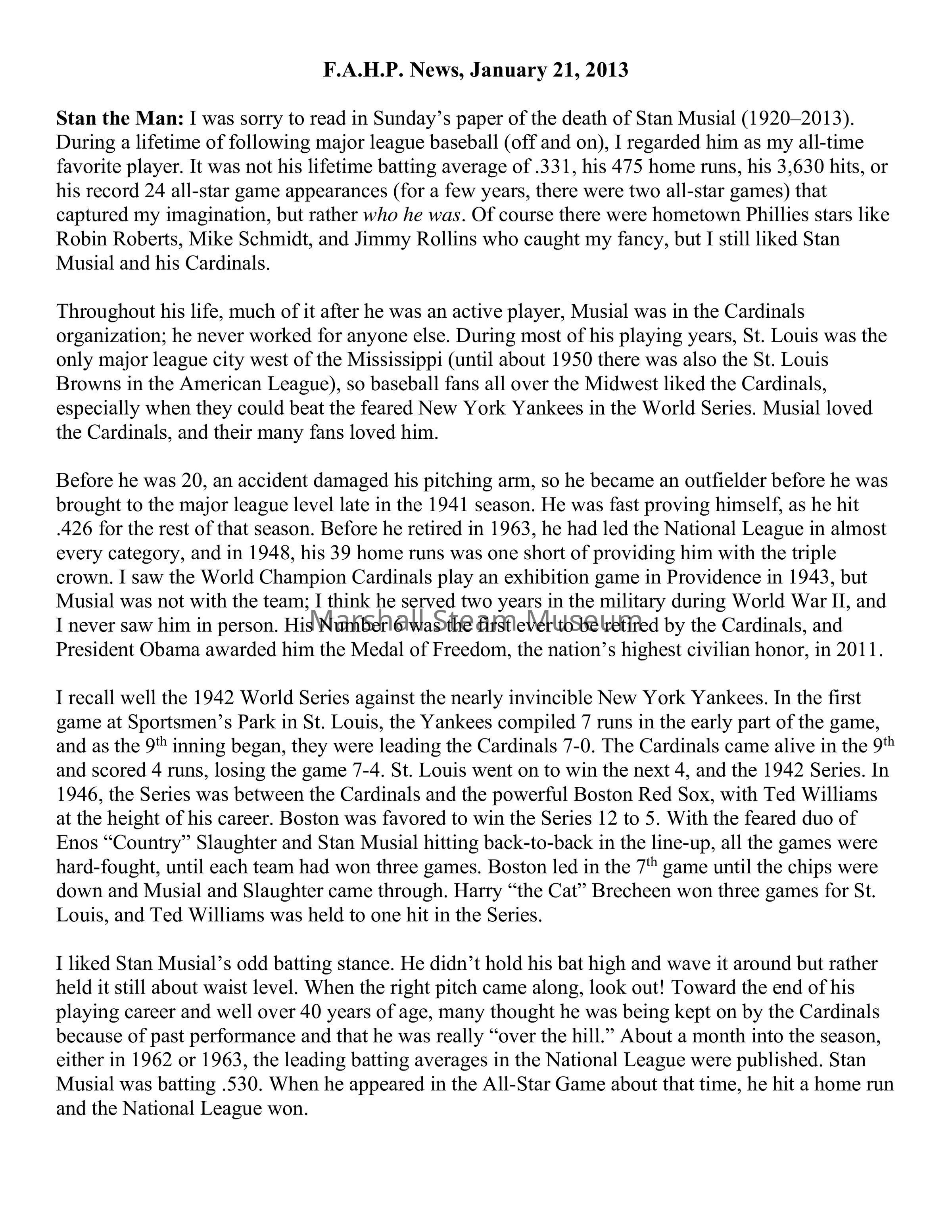 Stan the Man: I was sorry to read in Sunday’s paper of the death of Stan Musial (1920–2013). During a lifetime of following major league baseball (off and on), I regarded him as my all-time favorite player. It was not his lifetime batting average of .331, his 475 home runs, his 3,630 hits, or his record 24 all-star game appearances (for a few years, there were two all-star games) that captured my imagination, but rather who he was. Of course there were hometown Phillies stars like Robin Roberts, Mike Schmidt, and Jimmy Rollins who caught my fancy, but I still liked Stan Musial and his Cardinals.