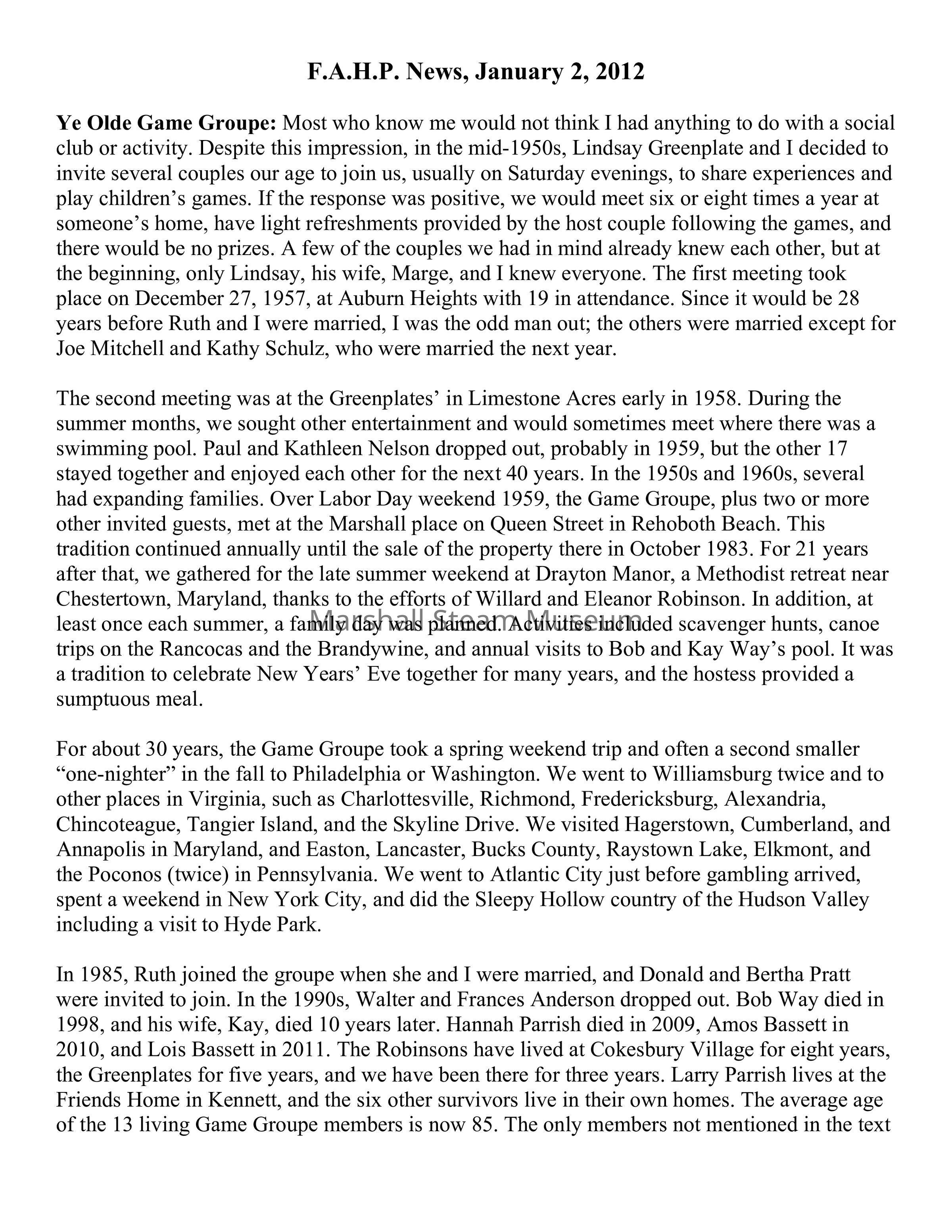In 1985, Ruth joined the groupe when she and I were married, and Donald and Bertha Pratt were invited to join. In the 1990s, Walter and Frances Anderson dropped out. Bob Way died in 1998, and his wife, Kay, died 10 years later. Hannah Parrish died in 2009, Amos Bassett in 2010, and Lois Bassett in 2011. The Robinsons have lived at Cokesbury Village for eight years, the Greenplates for five years, and we have been there for three years. Larry Parrish lives at the Friends Home in Kennett, and the six other survivors live in their own homes. The average age of the 13 living Game Groupe members is now 85. The only members not mentioned in the text are Pownall and Peggy Jones, who travel a lot, enjoy good health, and live in their own home in New Garden Township.